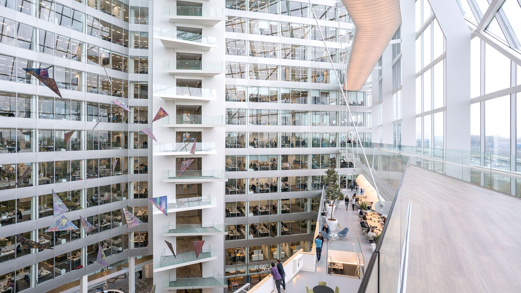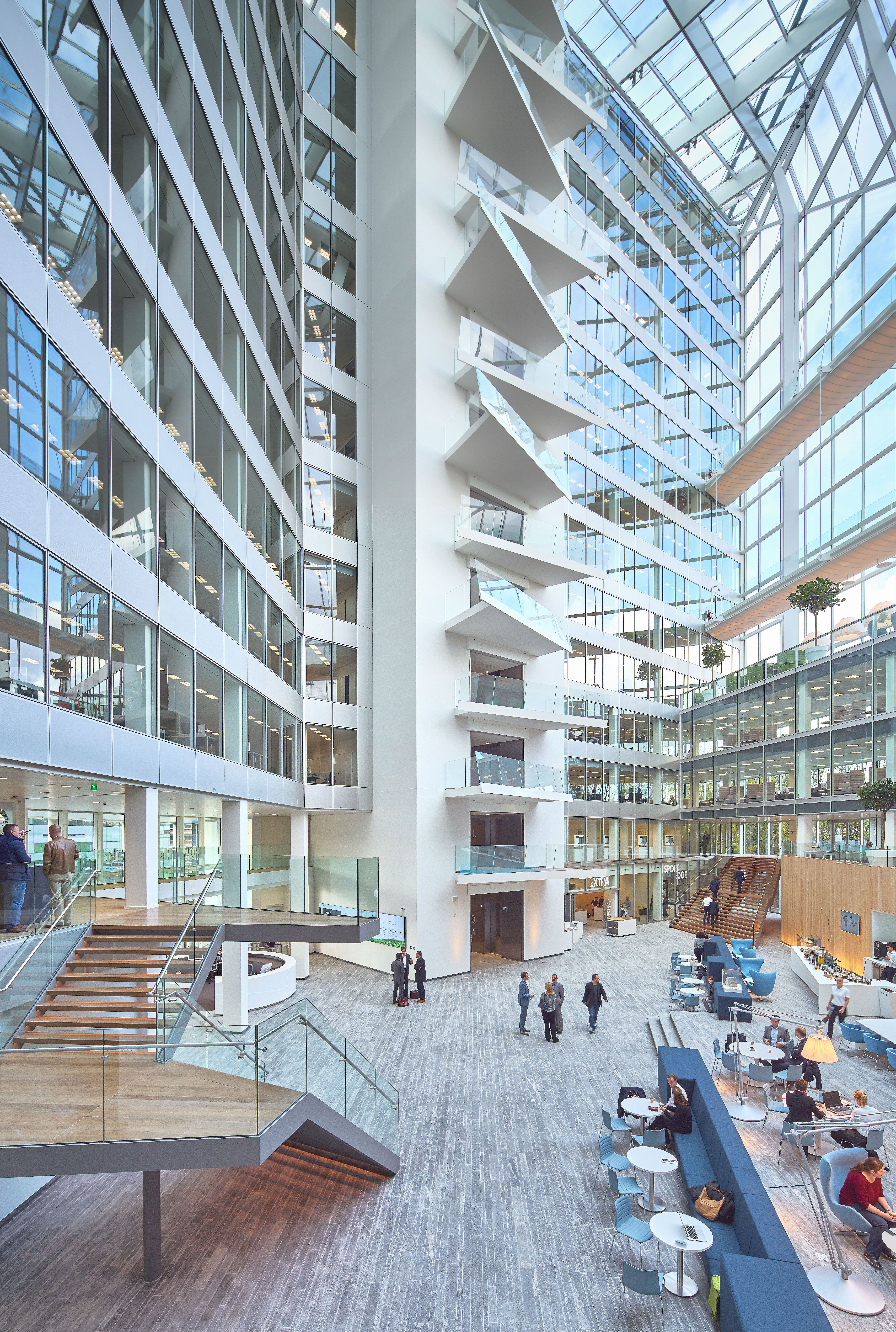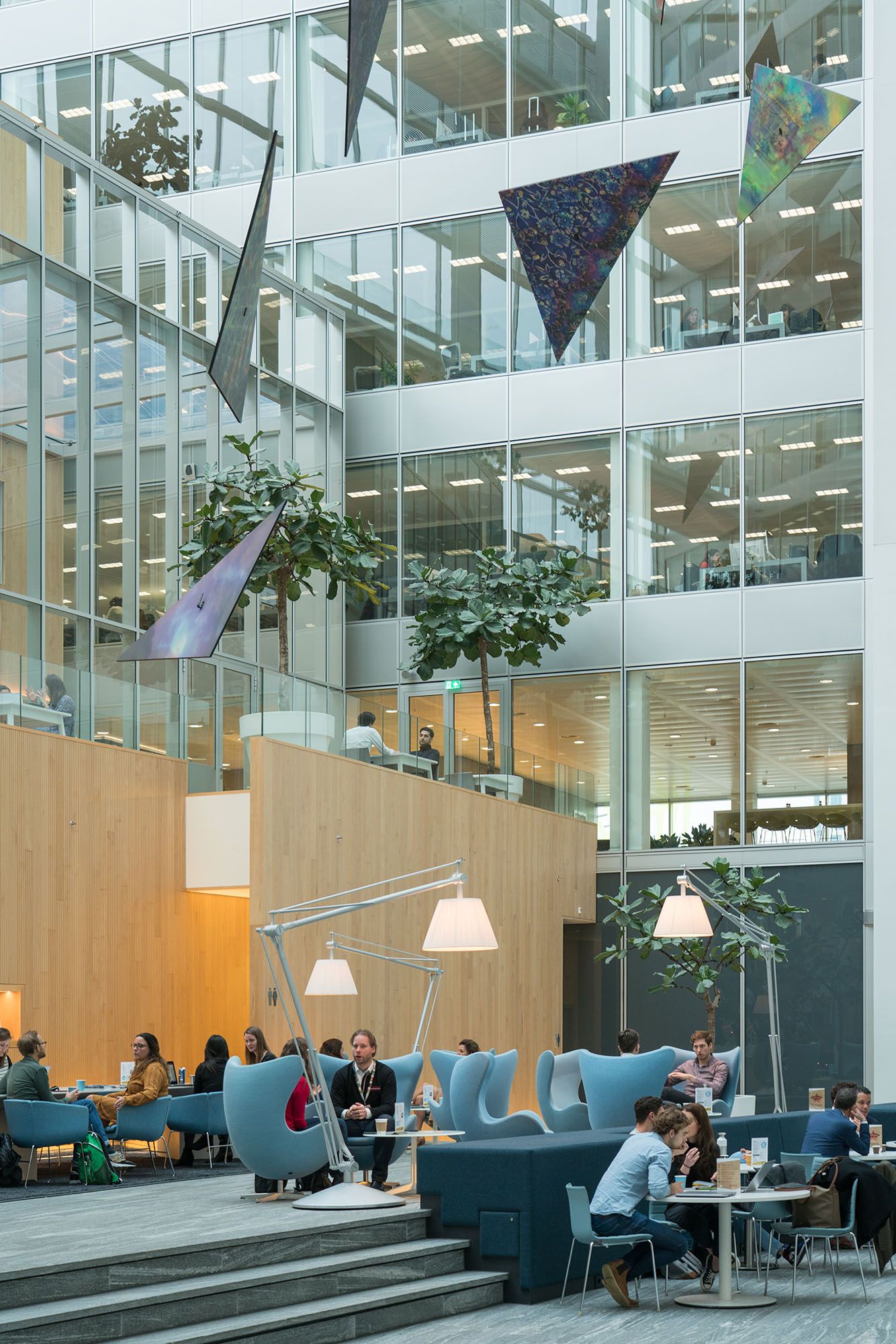 A central atrium organises the building around movement, visibility and interaction, creating a highly connected workplace environment. Social spaces, circulation and work settings are layered together to support collaboration and a more dynamic experience of the office.