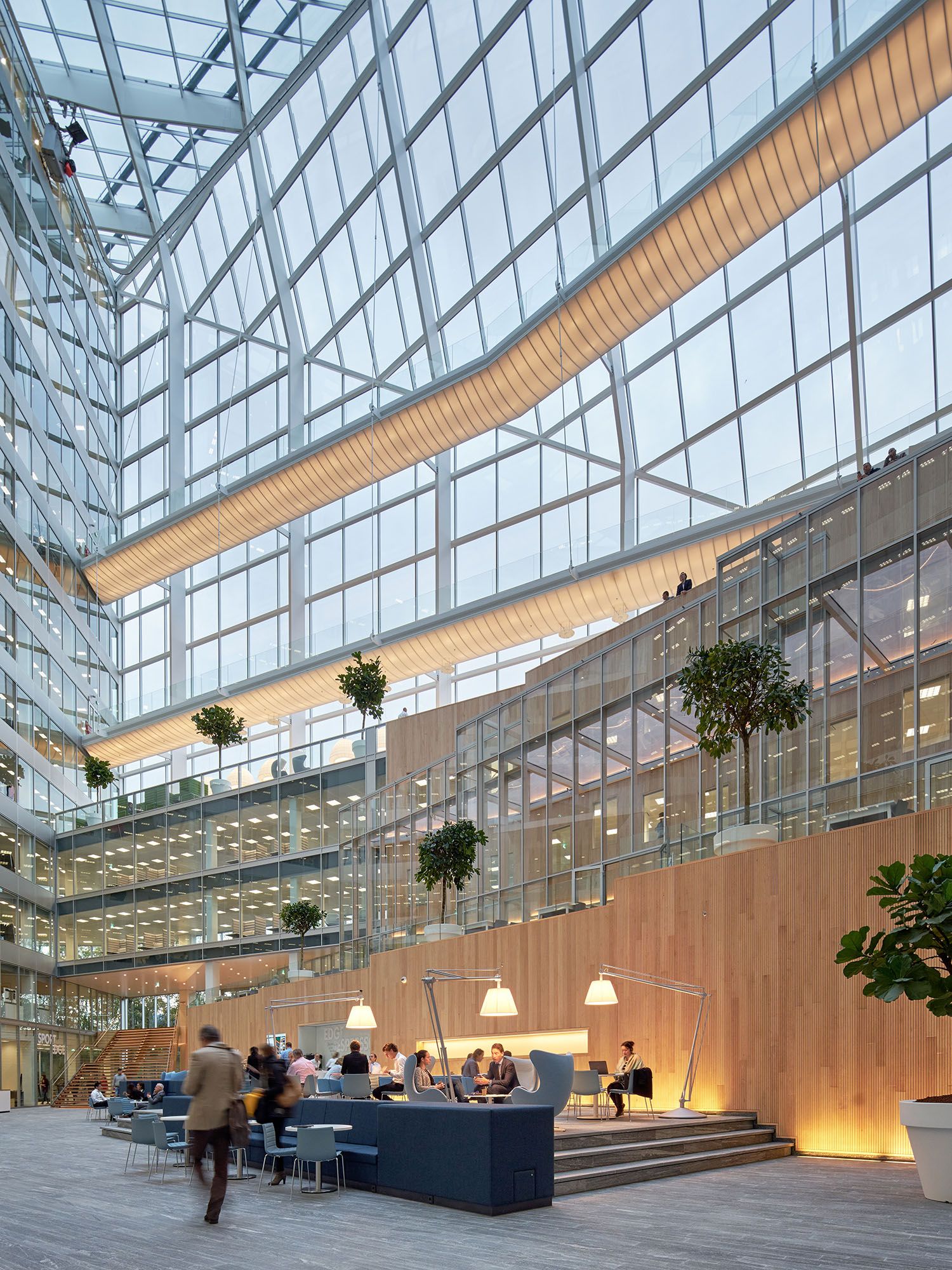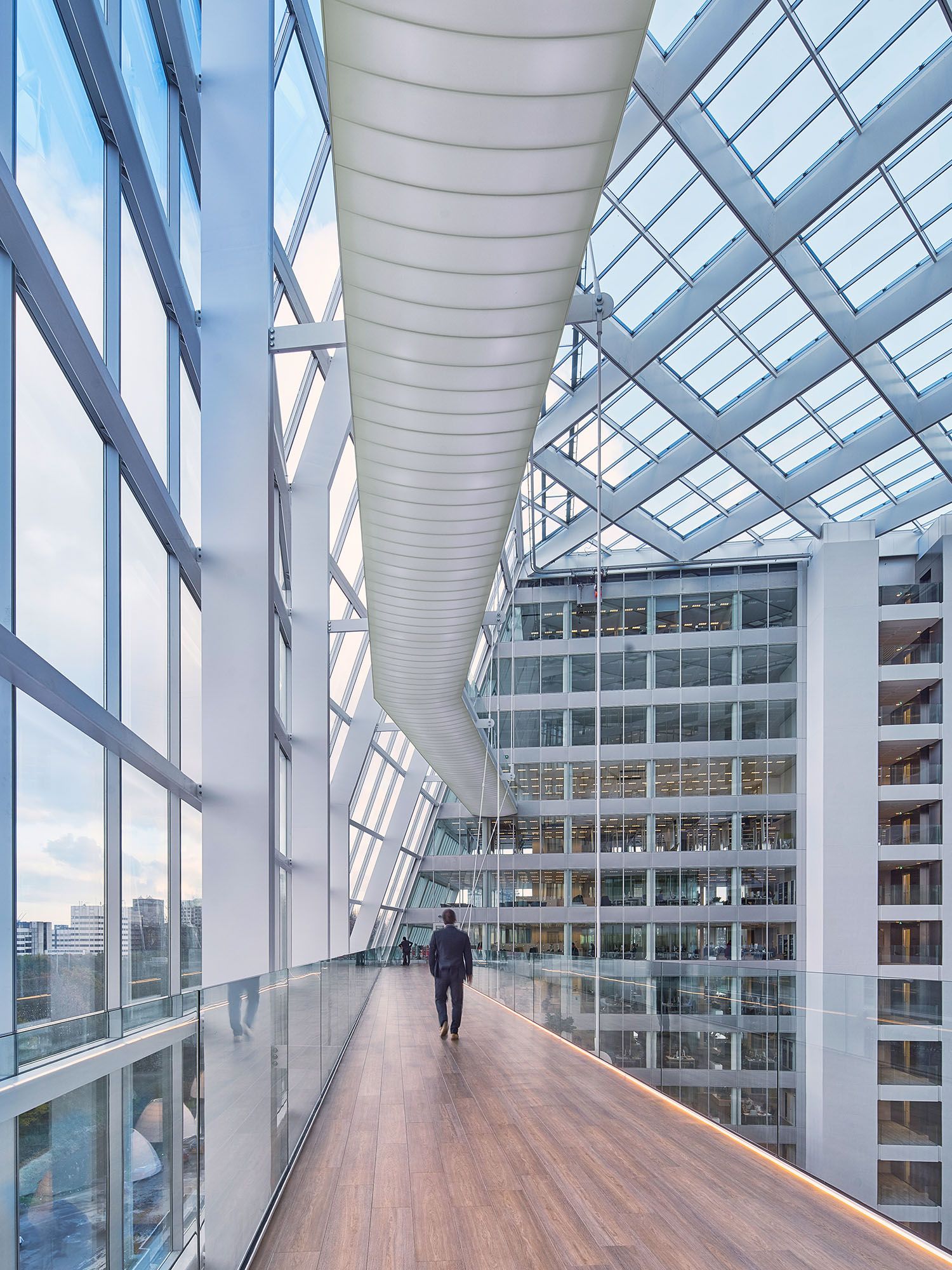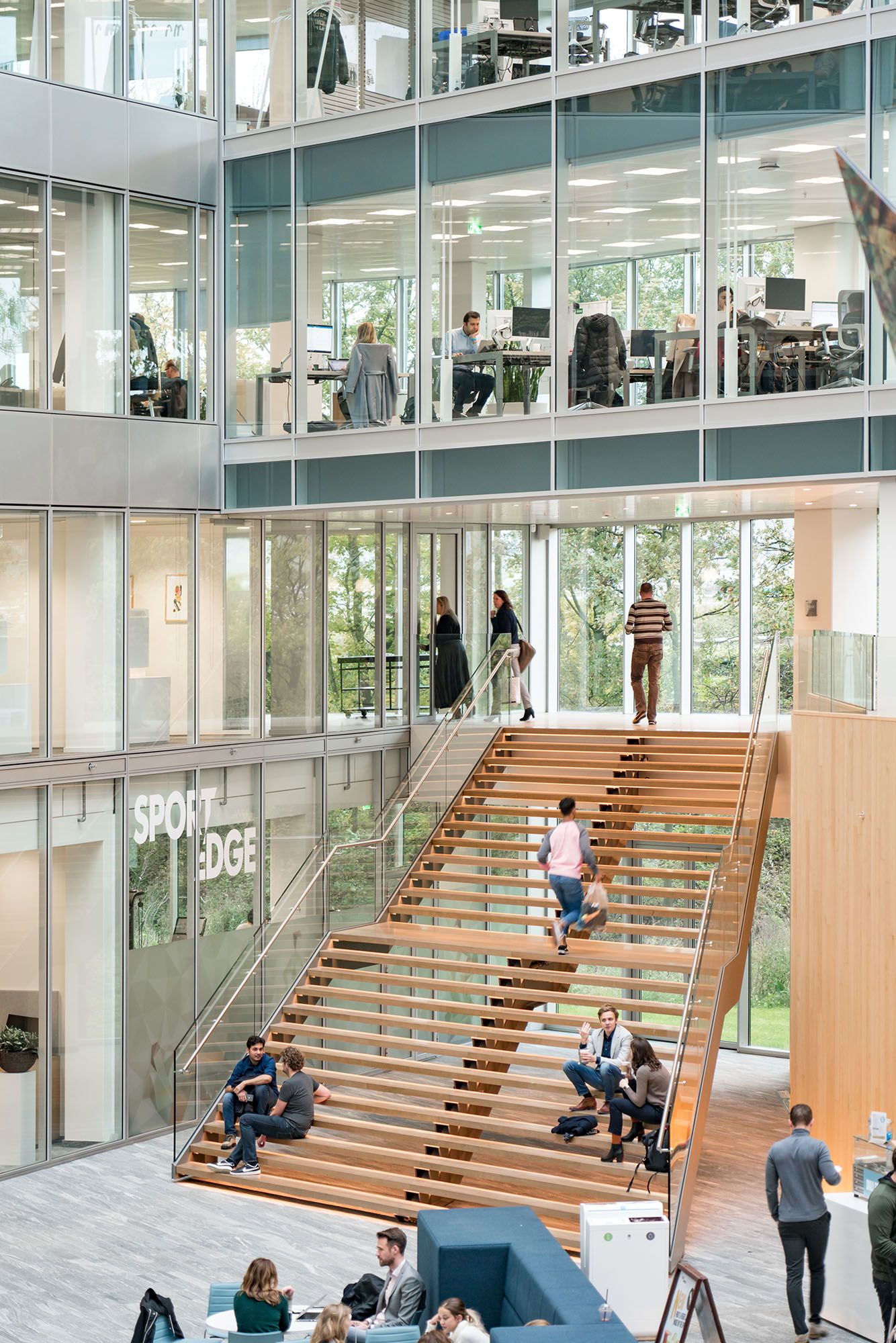 At the centre of the building is a large multi-storey atrium conceived as a social condenser, bringing together circulation, meeting spaces and informal working environments within one highly visible internal core. Bridges, exposed lift cores and layered social spaces create a workplace organised around interaction, movement and shared experience rather than fixed hierarchy or static desk space.