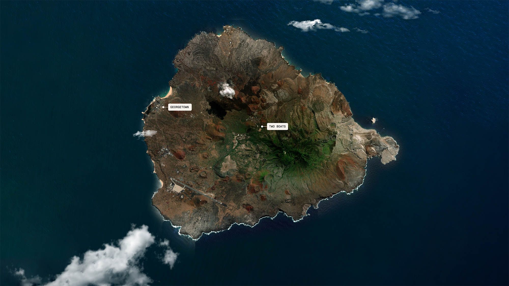 Satellite image of Ascension Island, with the two major towns Georgetown and Two Boats identified