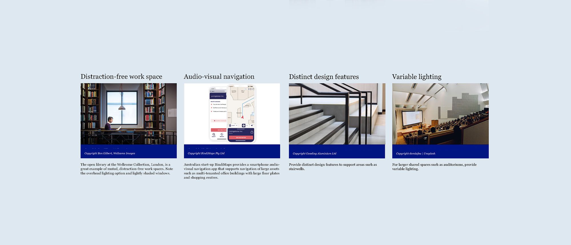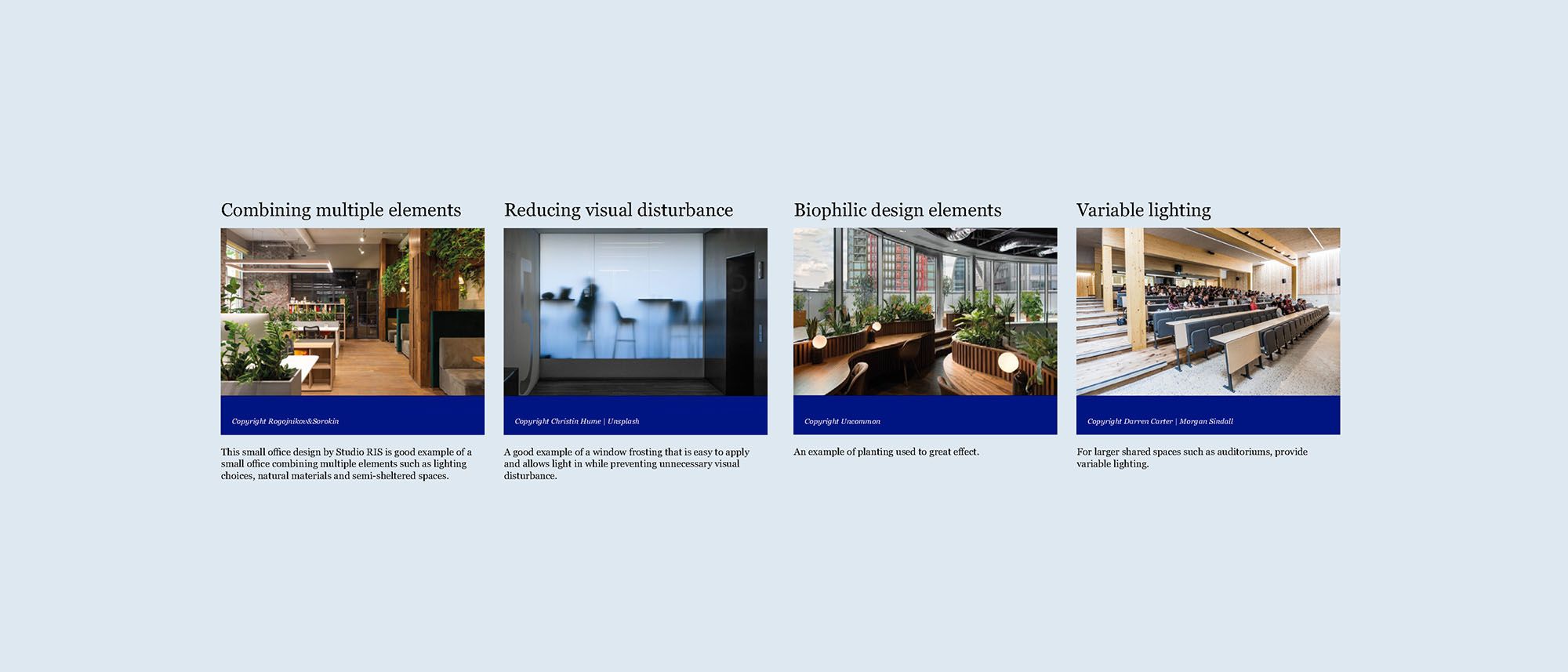 We recommend design strategies in the workplace for places, buildings, and spaces to enhance the health and well-being and experience of people who are neurodivergent.