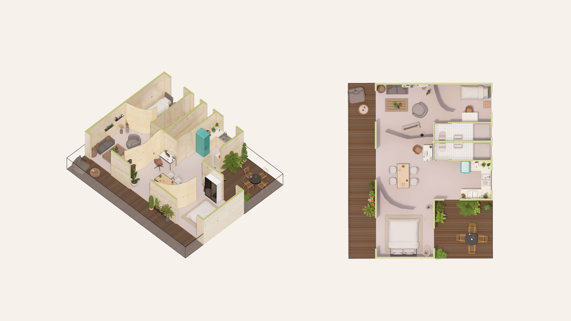 In back to back London Design Biennales, the Centre for Natural Material Innovation of the University of Cambridge and PLP Labs explored a new concept of living based upon a home that transforms with you. Unfolding (2021) and Ephemeral (2023) showcase how engineered timber partitions that are flexible and movable can replace walls.