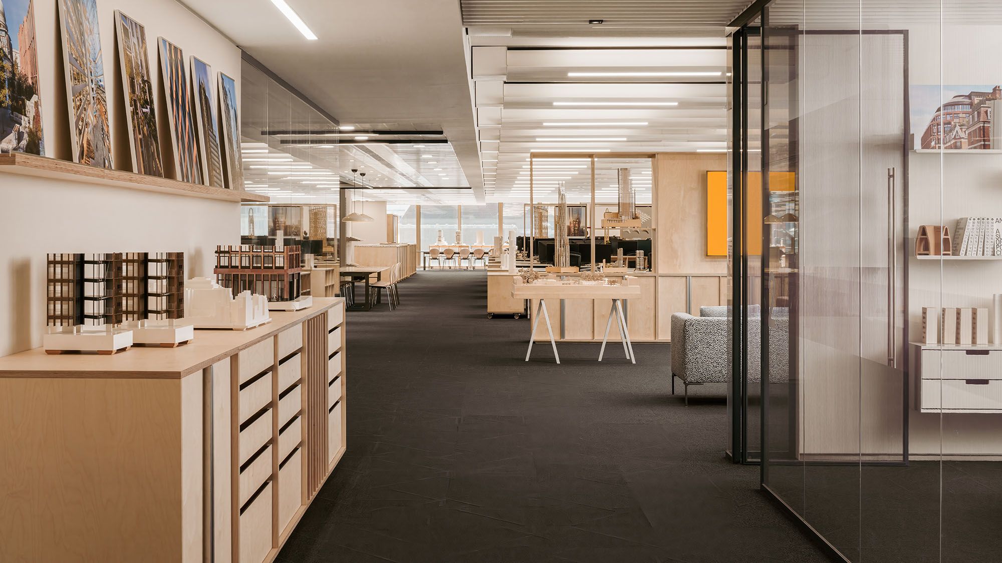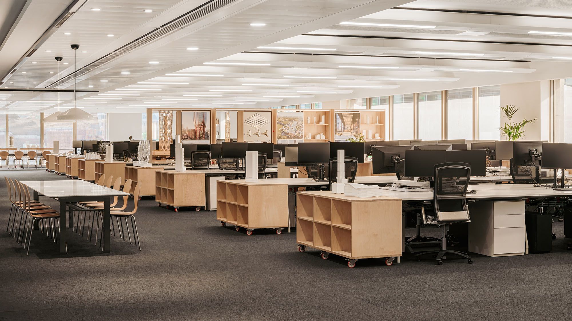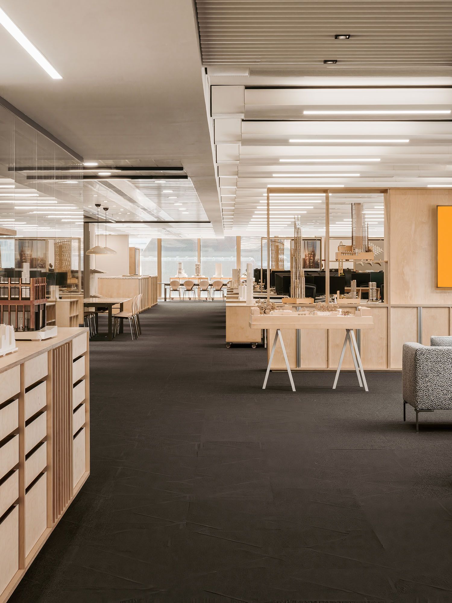 By reusing and repurposing 92% of materials across both their old and new spaces, the team achieved a 68% cost reduction and saved 175 tonnes of carbon compared to a traditional London office fit-out. The result is a studio that feels fresh, flexible and deeply connected to the practice’s work – with details such as terrazzo worktops made in collaboration with Solus Ceramics, crafted from material samples of past PLP projects including 60 Curzon, 4 Cannon Street and Park Modern.