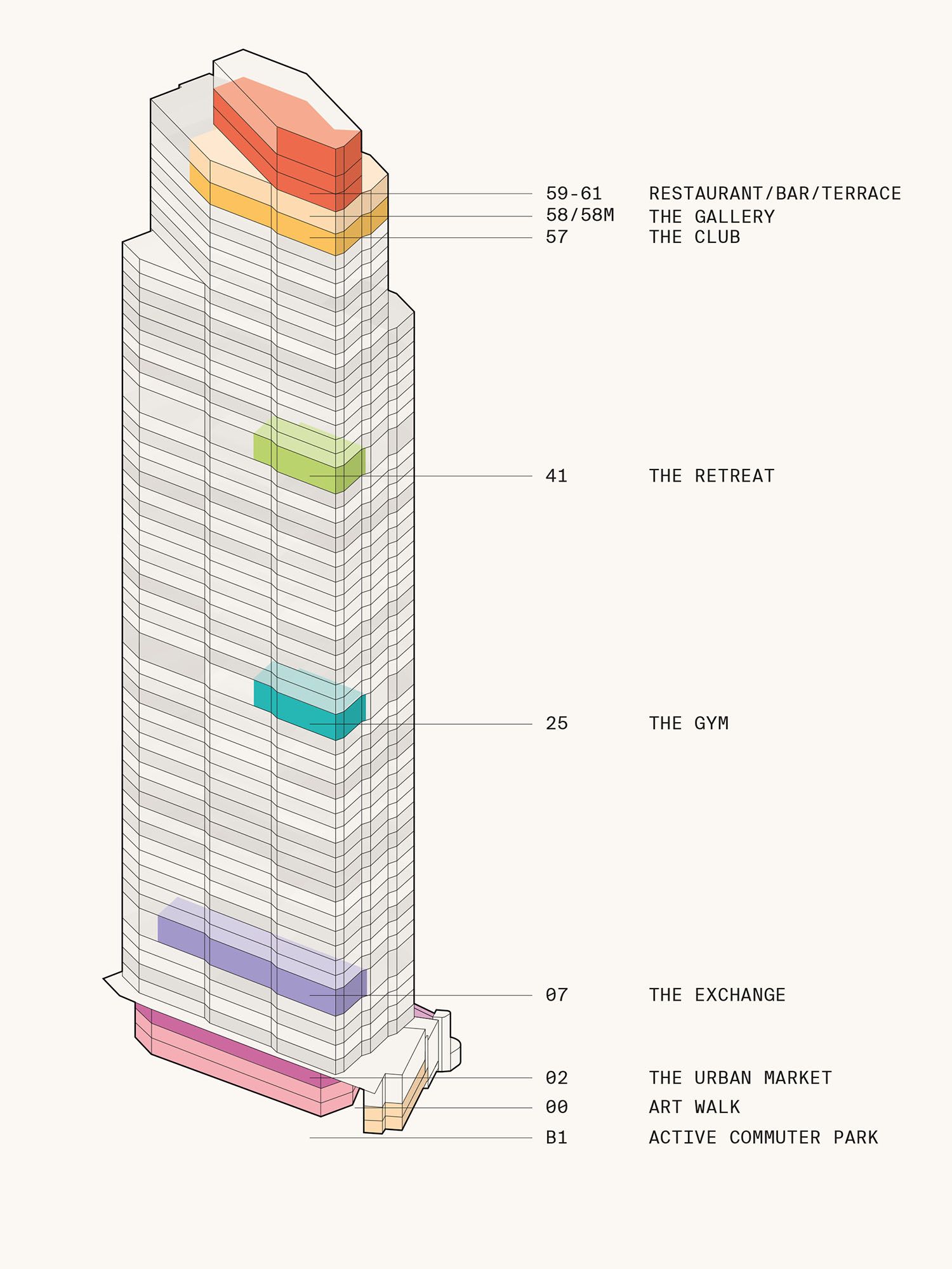 At ground level, the project improves pedestrian movement through the City cluster, introducing new public realm and strengthening connections to the surrounding streets. Higher up, the building opens itself to the city through a rich mix of social, cultural and public-facing destinations, extending its role beyond that of a private workplace into a more civic urban destination.