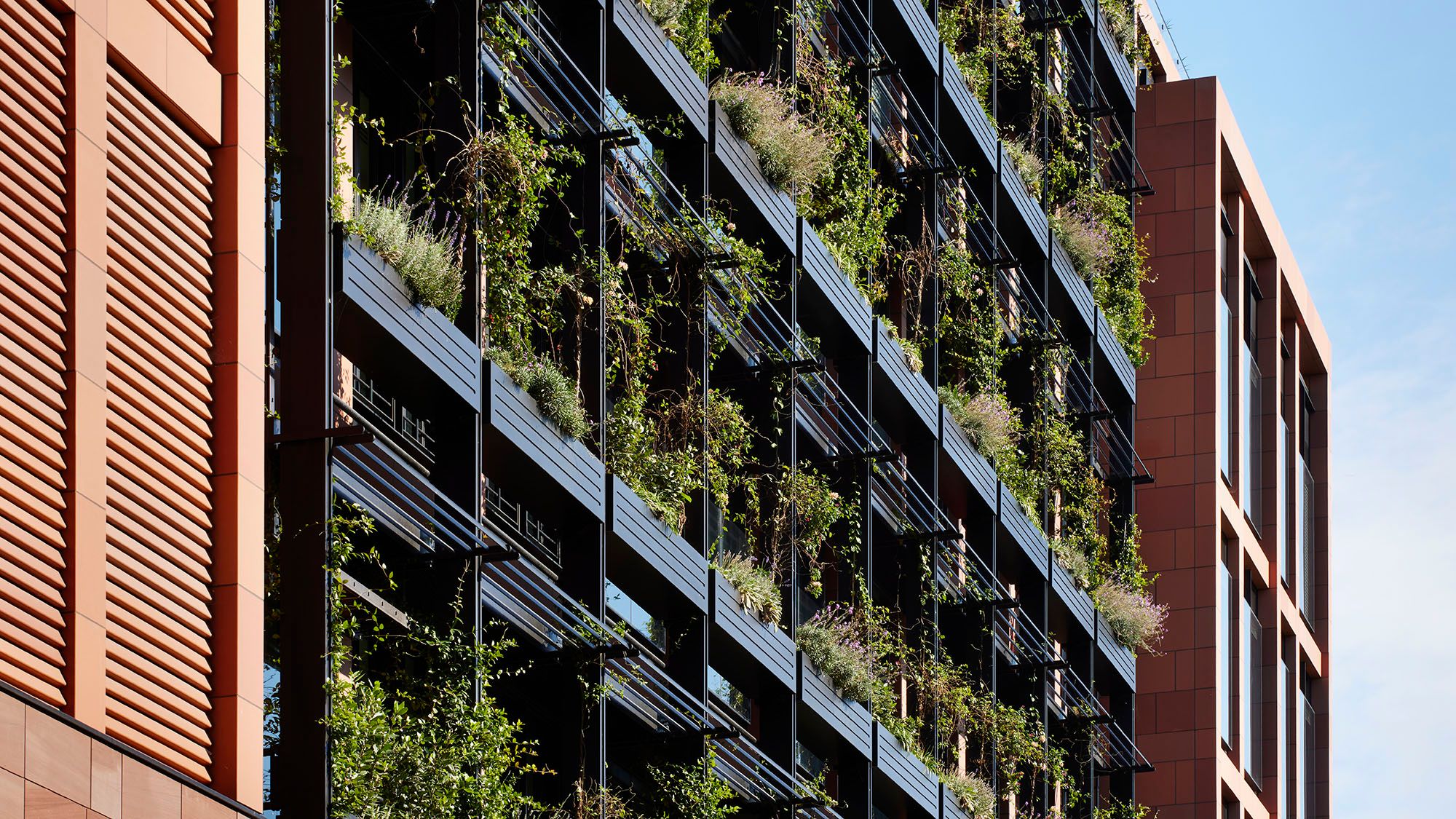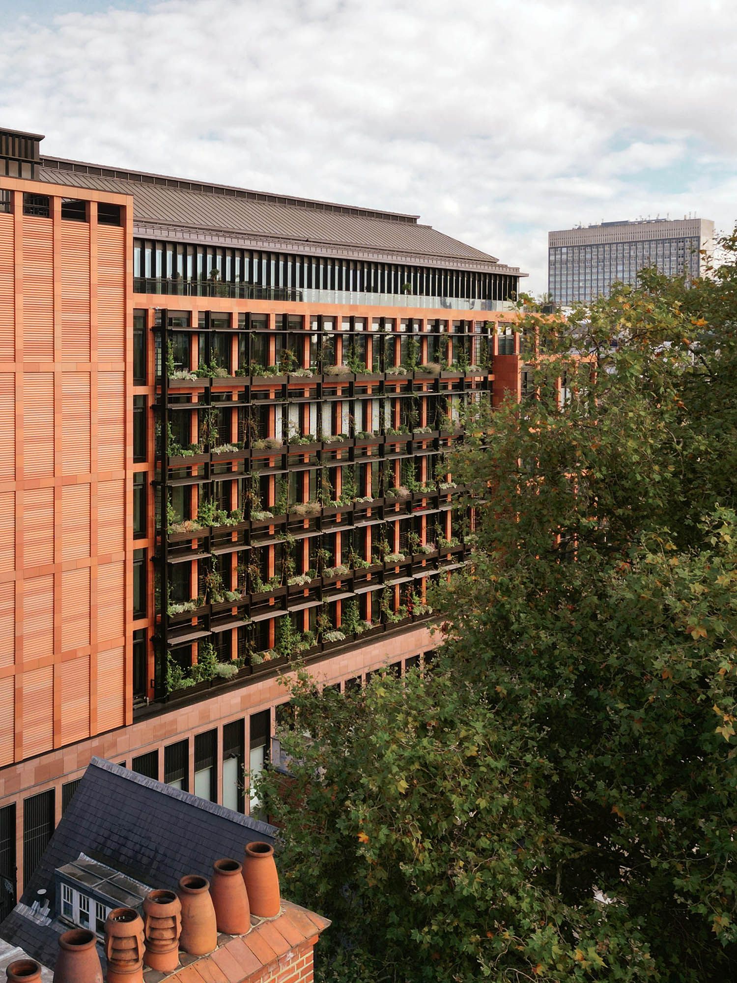 Nature is central to the architectural concept. A biodiverse green trellis wall climbs the building’s south façade, planted with local wildflower species to support biodiversity while creating a more biophilic environment for occupiers. This is paired with a public artwork by Clare Twomey on the western façade, drawing on local flora and helping to root the project more deeply in the site’s natural and cultural history.