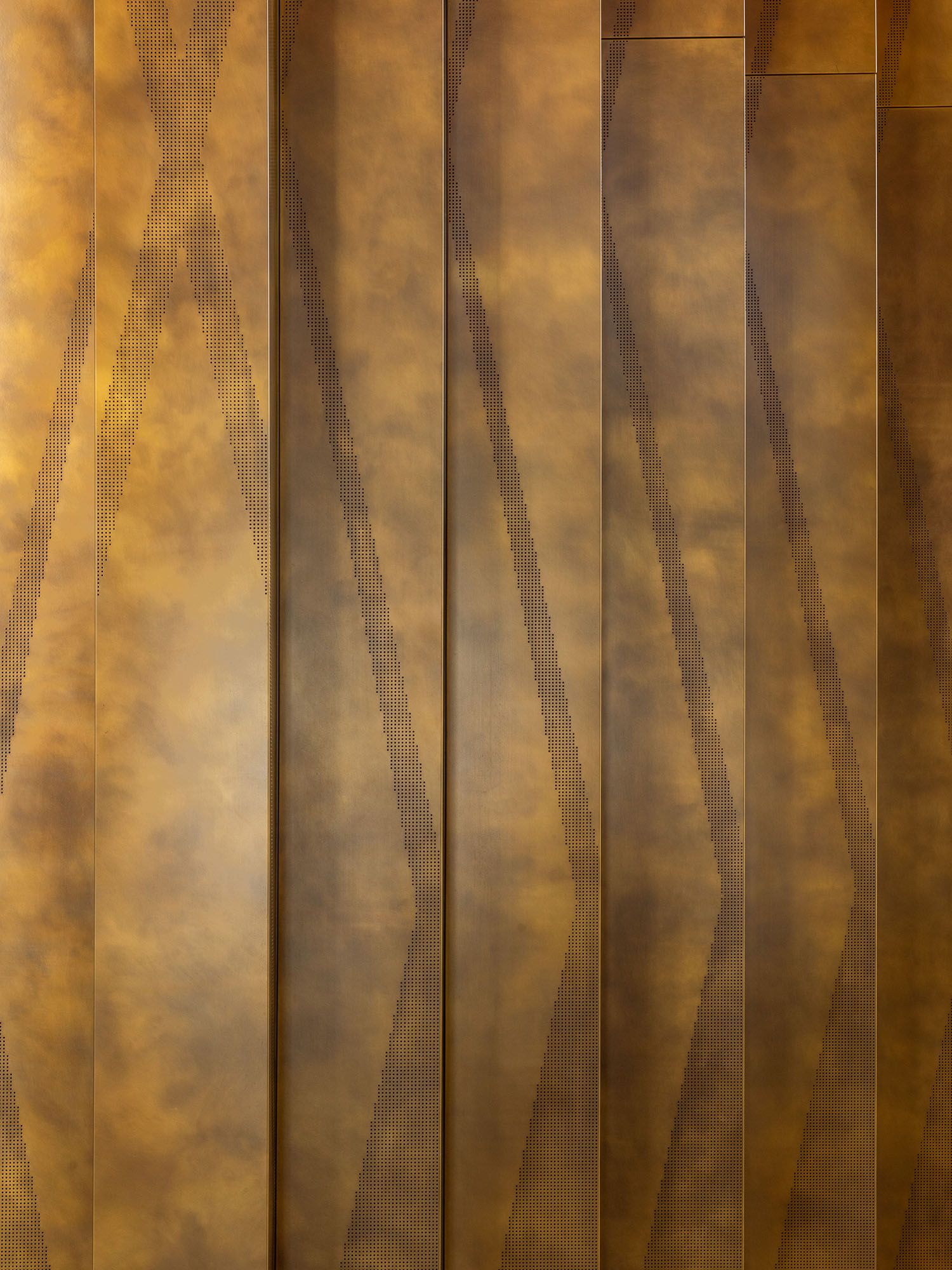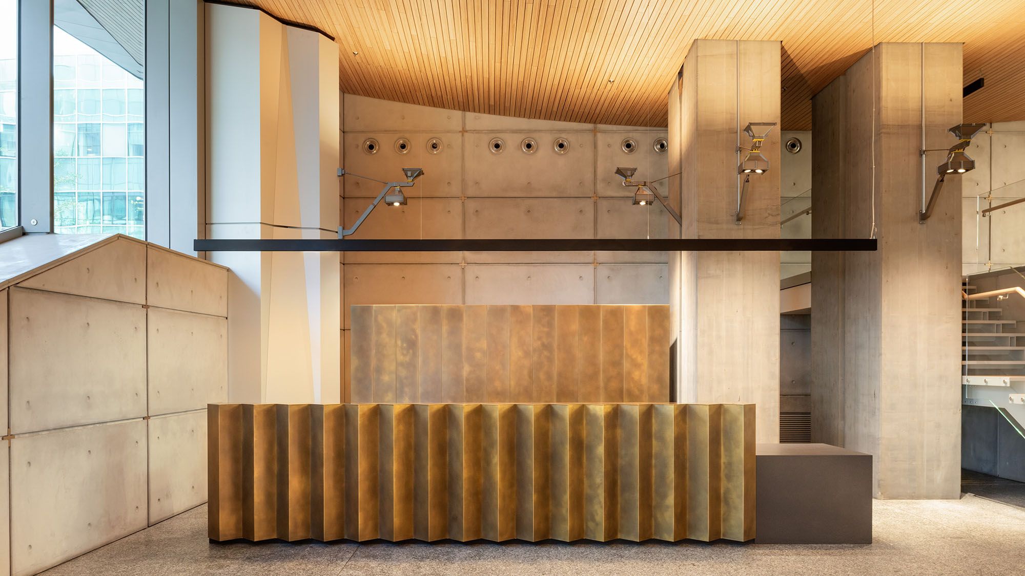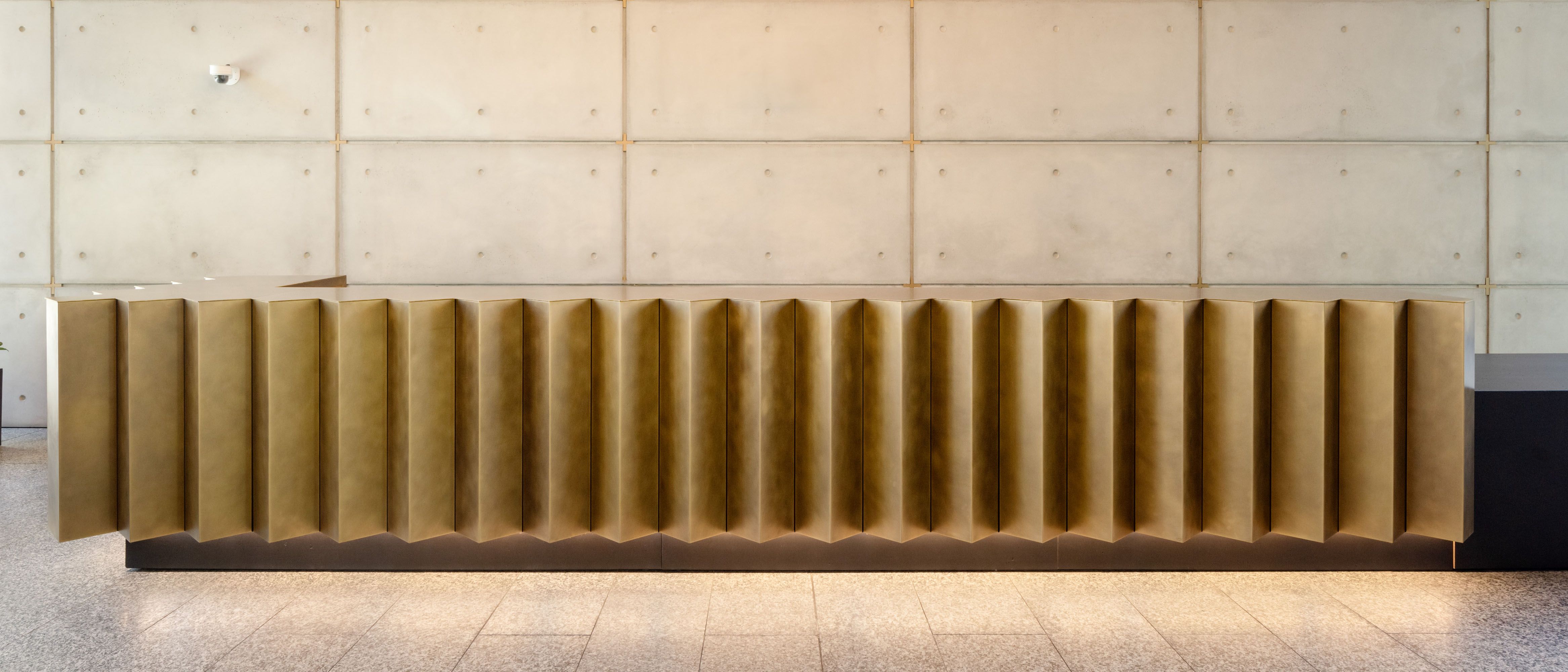 The reception is shaped by hand-crafted De Castelli metal finishes, giving the entrance a tactile and highly crafted quality. Set within a lowered arrival sequence, it creates a defined transition from the public realm into the workplace.