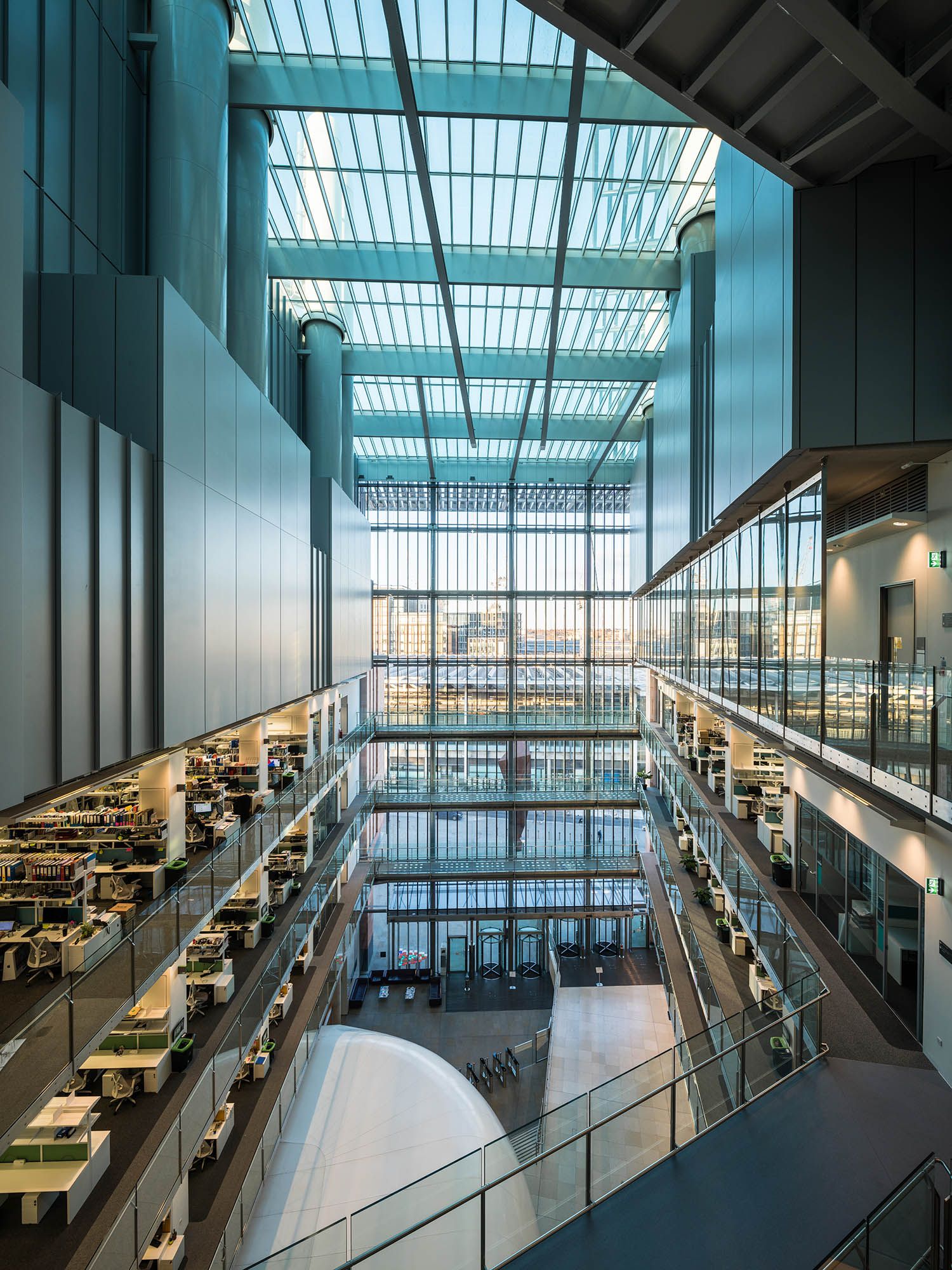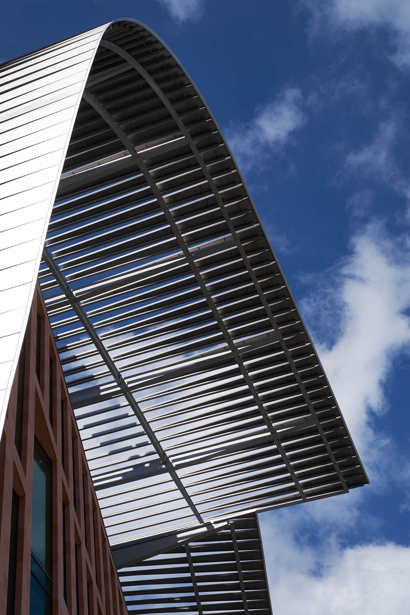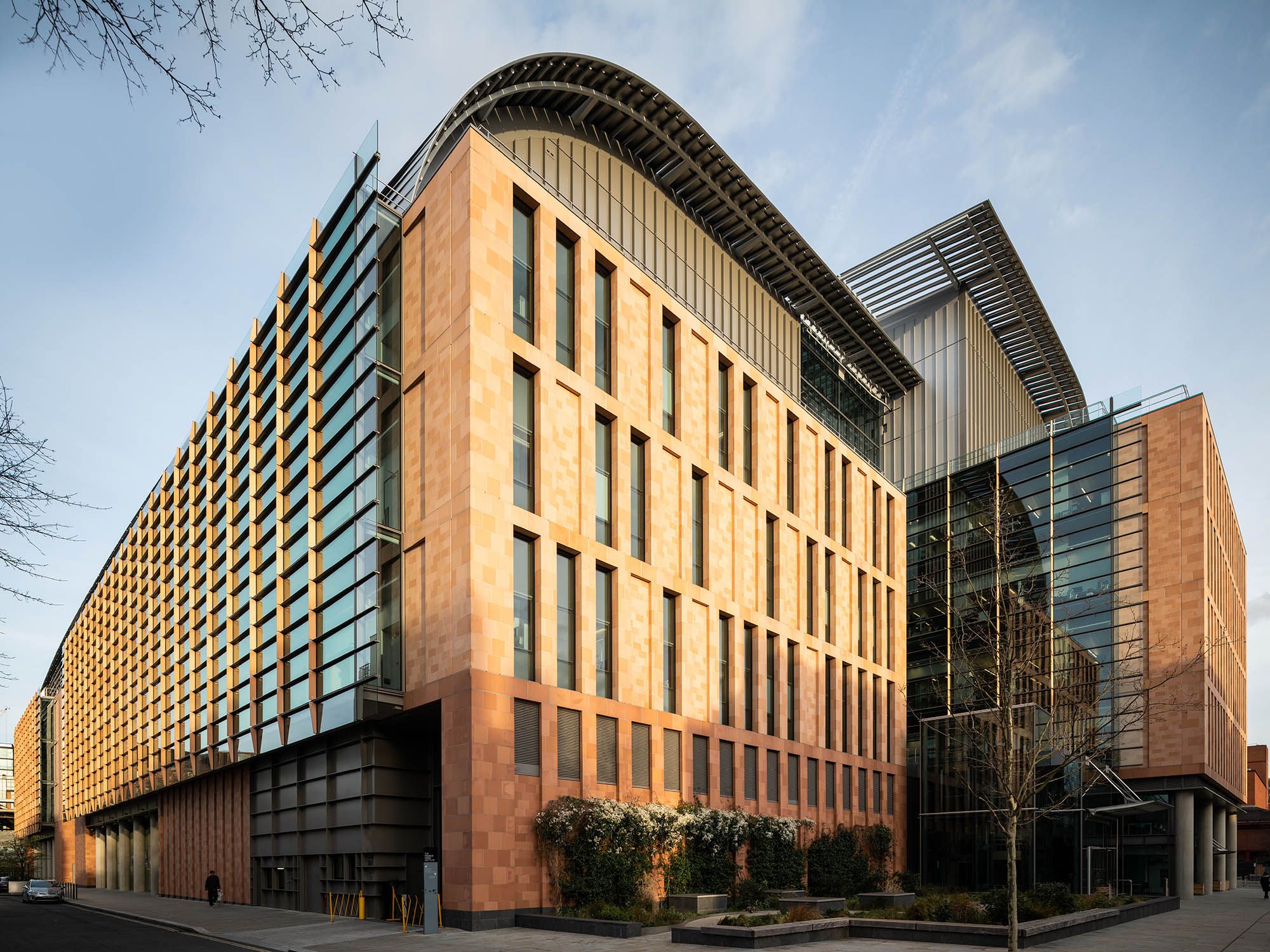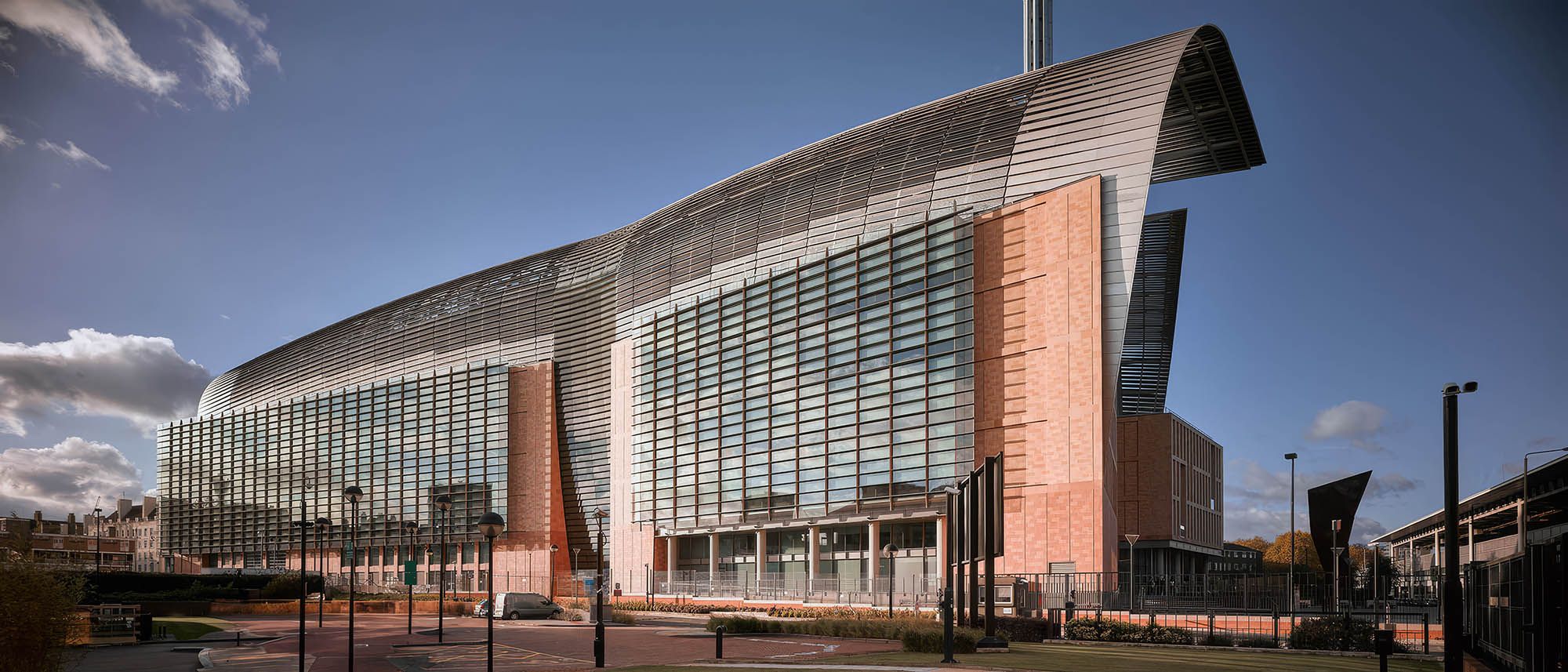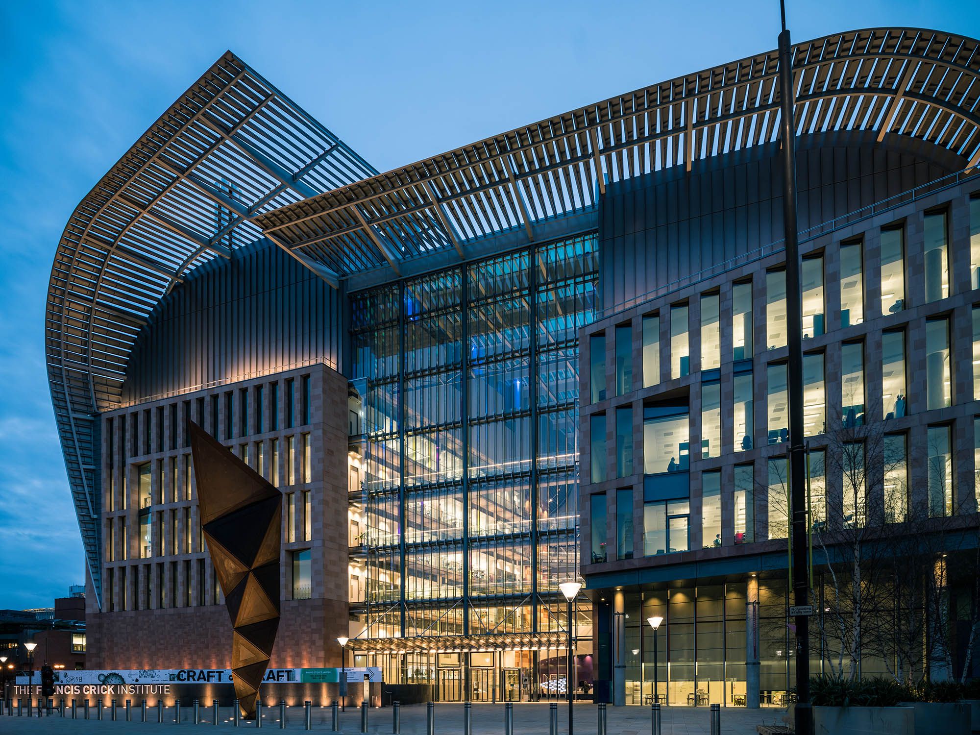 Its architectural expression responds directly to its prominent urban setting. A terracotta masonry base establishes a relationship with the surrounding historic context, while the curved roof forms draw on the industrial profile of nearby St Pancras. Together, these elements give the building a civic scale and identity that reflect the significance of the institution within London’s scientific landscape.