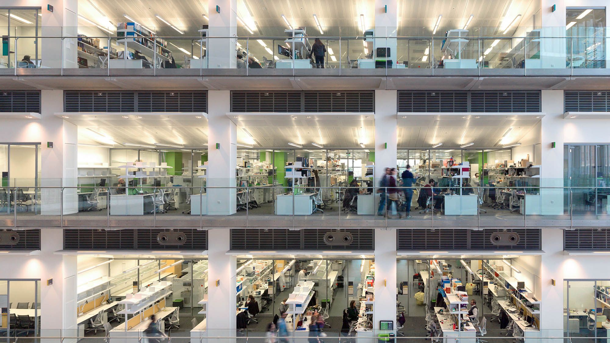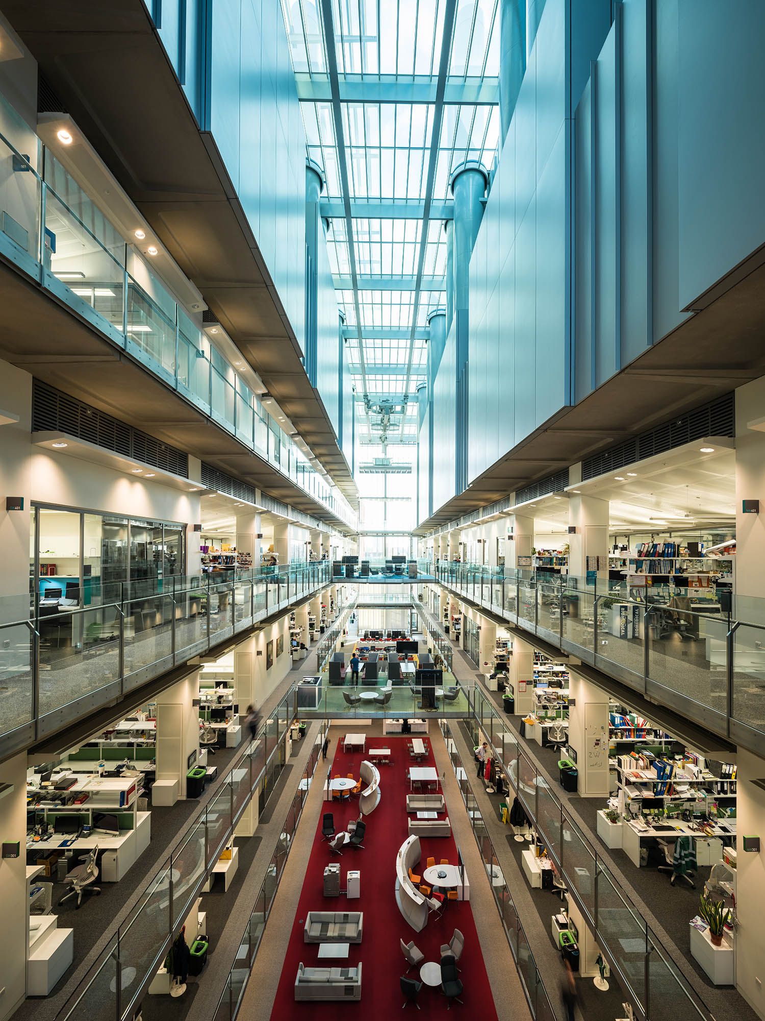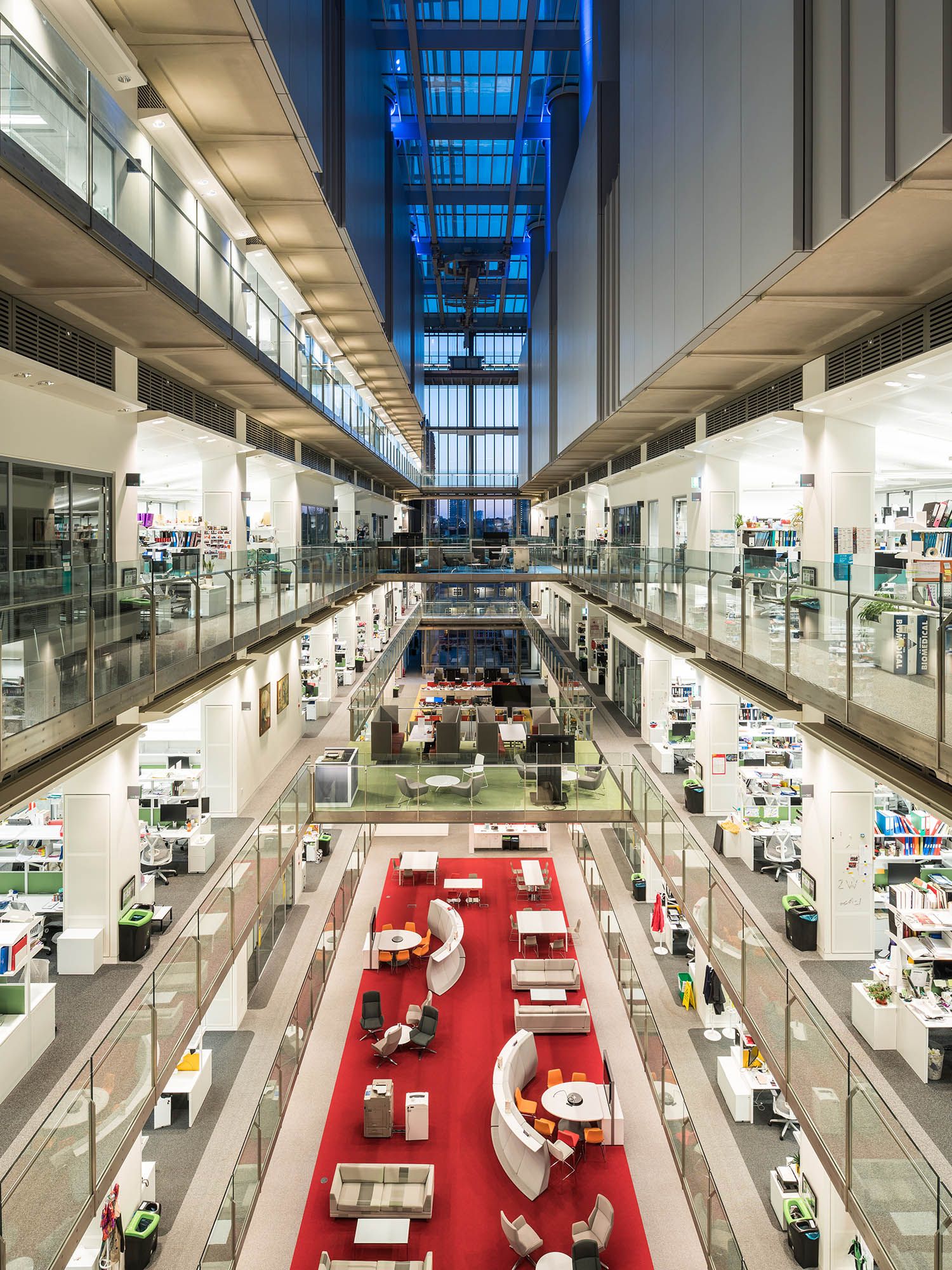 The building is organised around a central east–west atrium, with laboratory wings arranged to encourage movement, interaction and shared use across research teams. Highly flexible lab environments allow spaces to be adapted over time, supporting the changing needs of biomedical science while helping break down traditional barriers between disciplines.