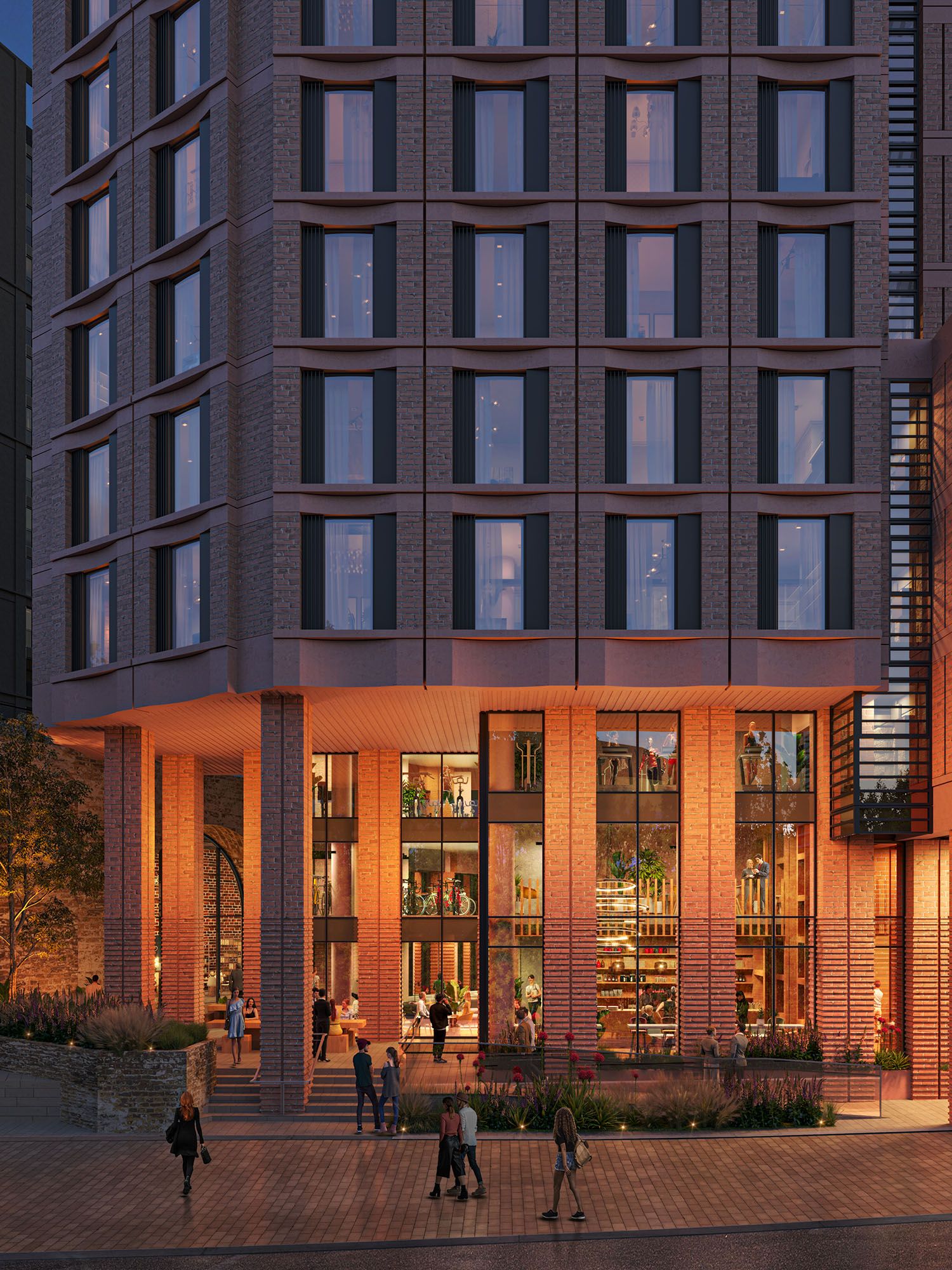 Retained railway arches and new pedestrian routes help connect the development to the surrounding neighbourhood, supporting creative enterprise and a more active public realm at ground level.