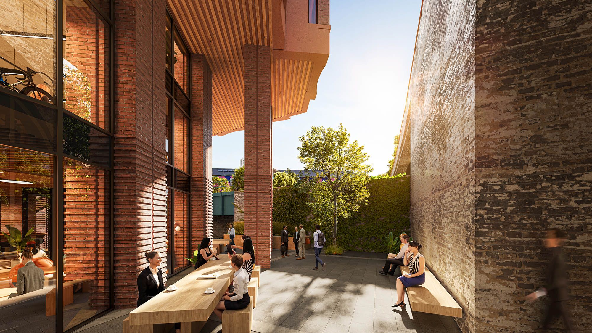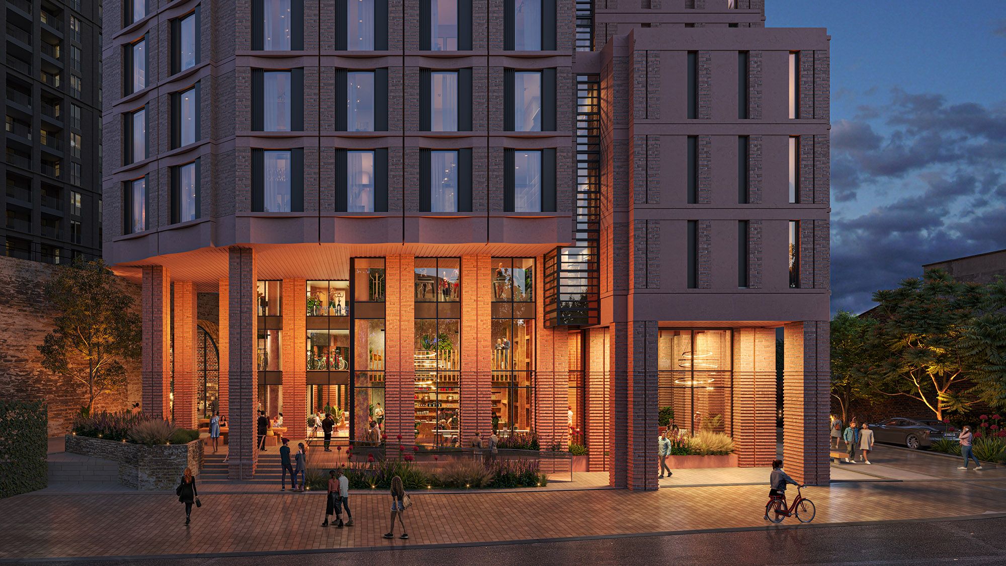 Materially, the architecture draws on the industrial character of the area through richly textured brick façades, scalloped lintels and a more robust urban expression. In contrast, the creative workspace introduces metallic finishes, green walls and openable glazed doors, giving the scheme a distinct identity while reflecting the mix of living, making and enterprise that defines the project.