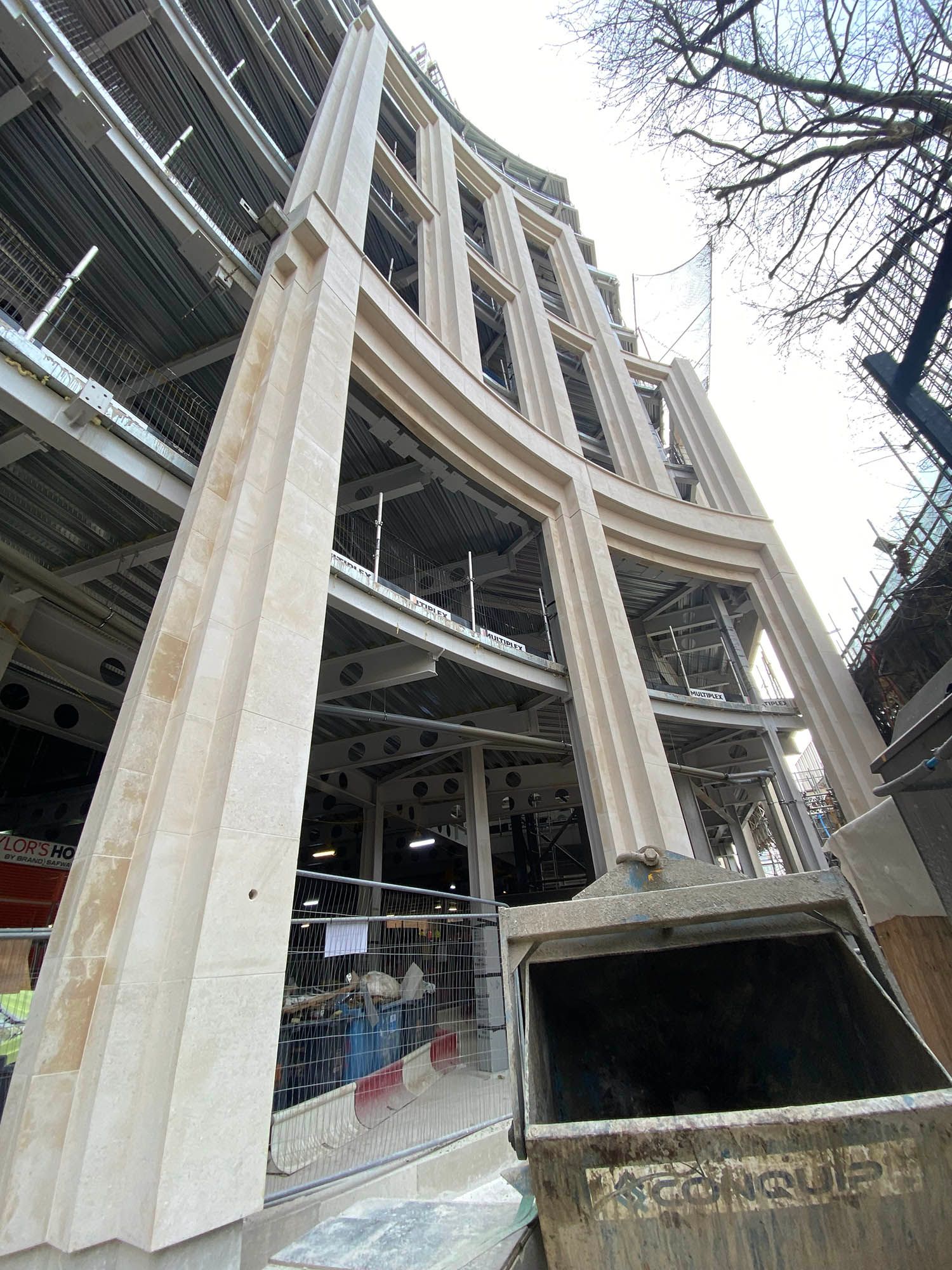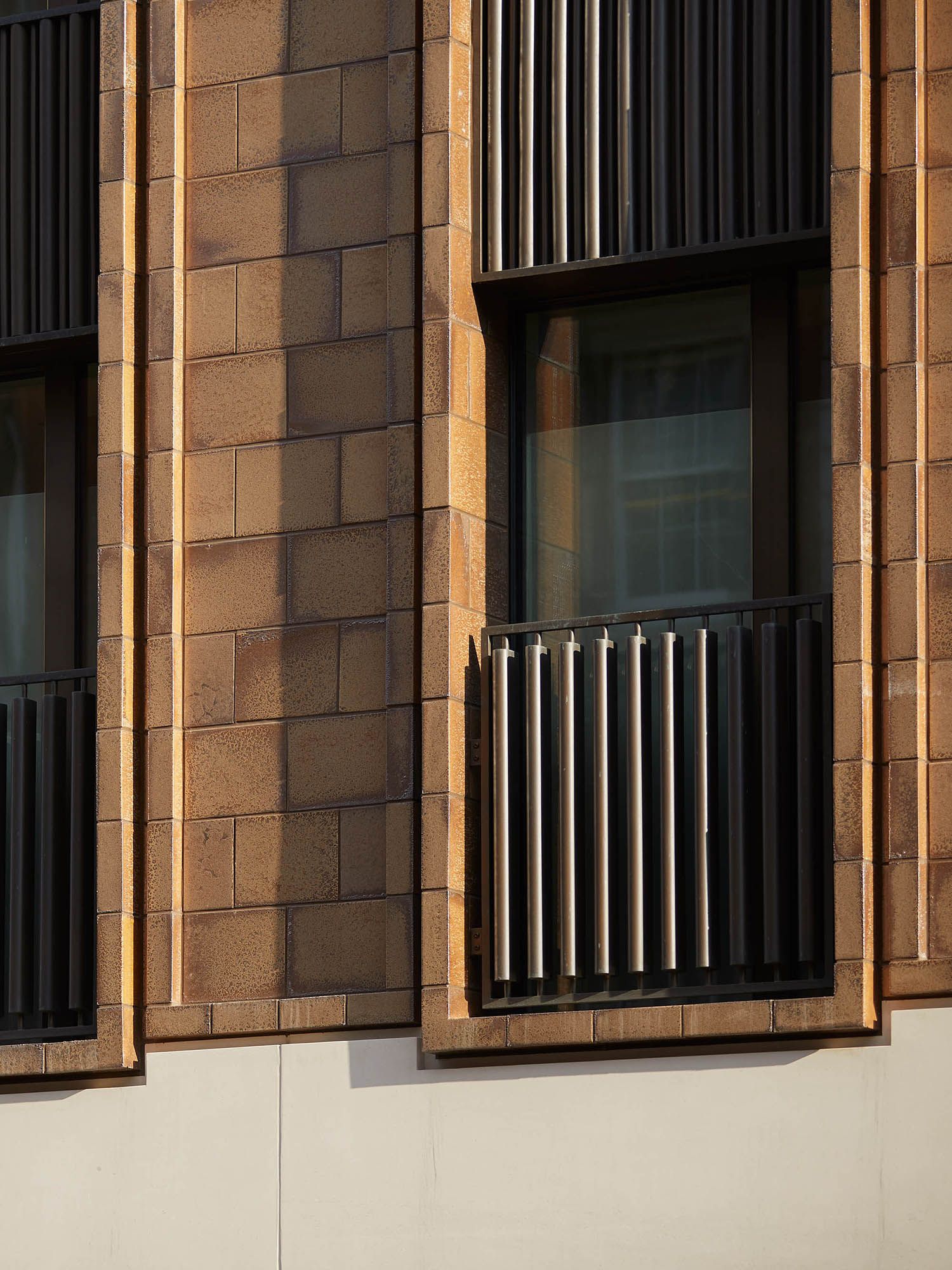 The building responds directly to its historic context, integrating the listed gatehouse and reusing Portland Stone to form a new masonry base. Above, a lighter contemporary expression of vertical fins creates a careful balance between continuity and contrast within the streetscape.