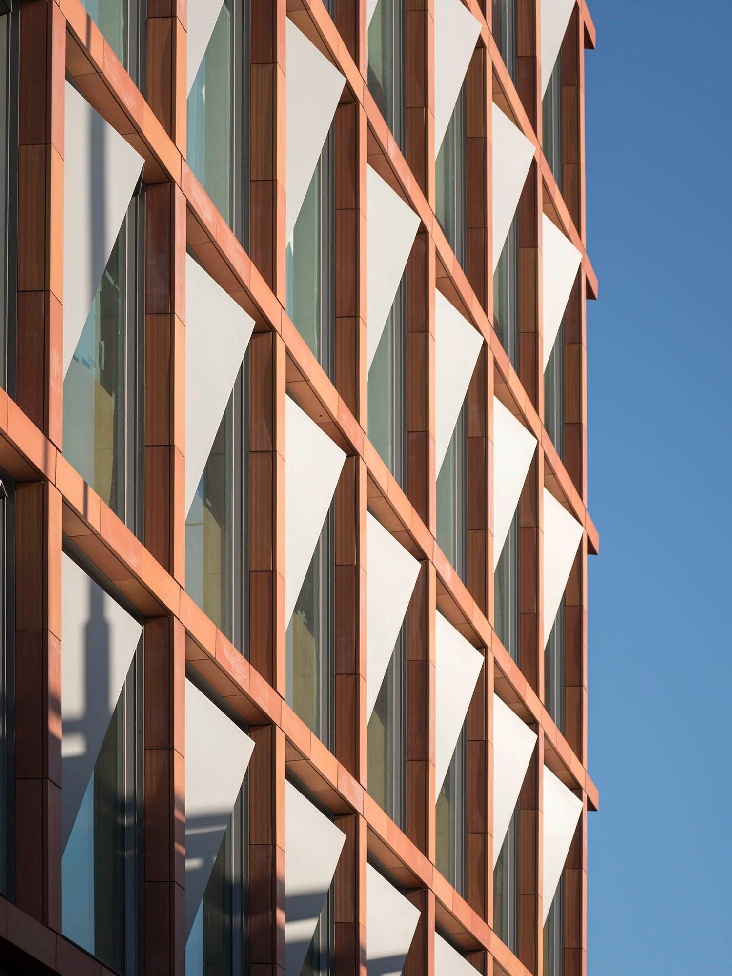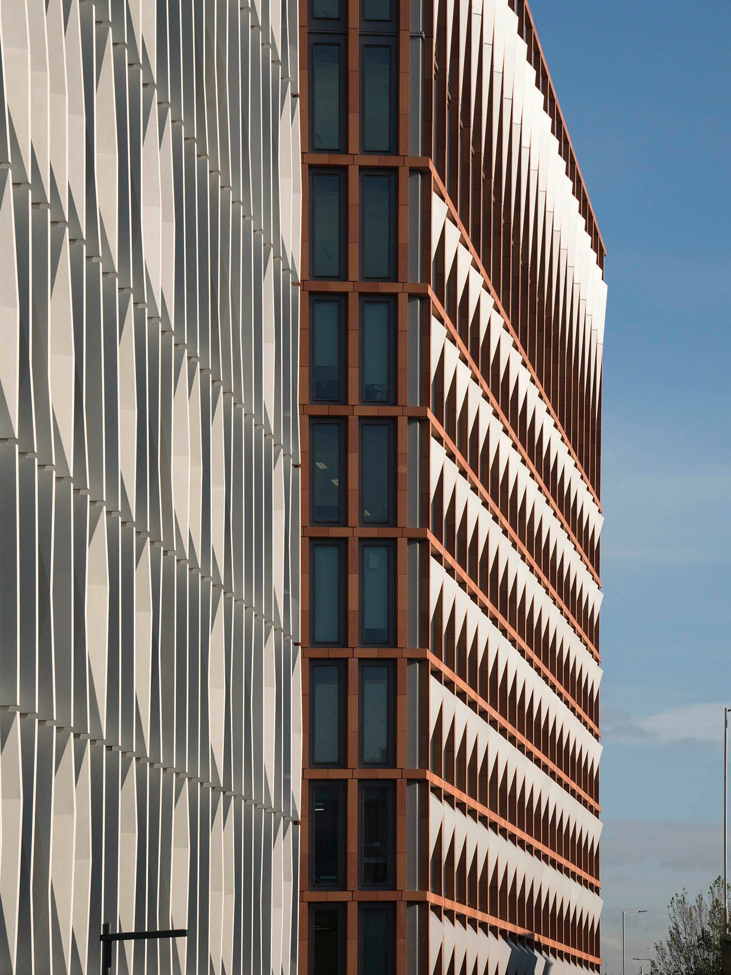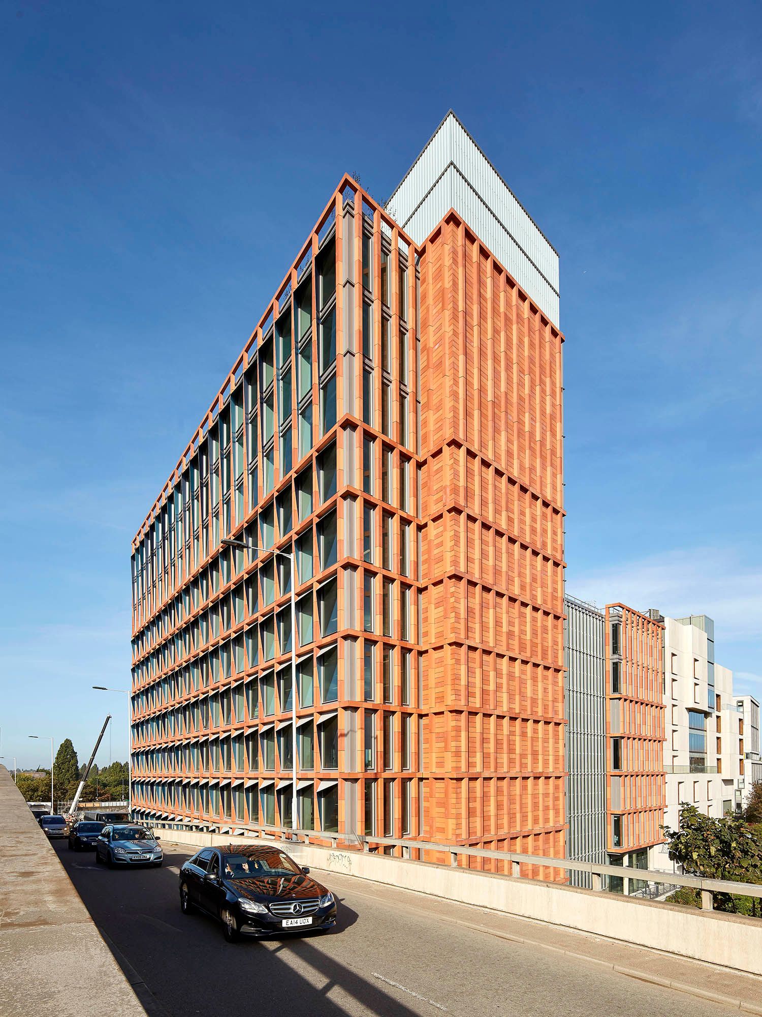 The façade combines glass, terracotta and folded metal panels to create a layered architectural expression with depth, rhythm and environmental performance. This gives the building a strong presence within White City while reinforcing its role as a visible part of London’s emerging innovation district.