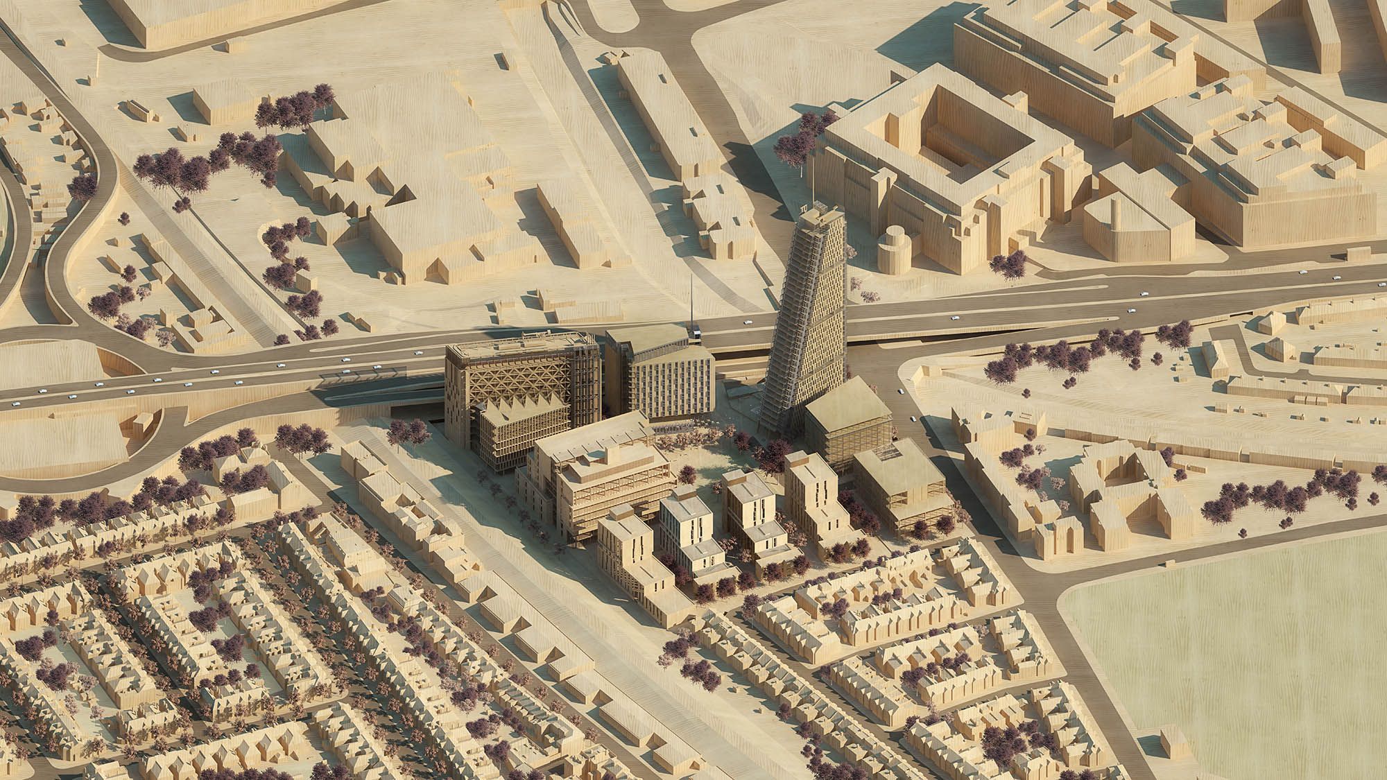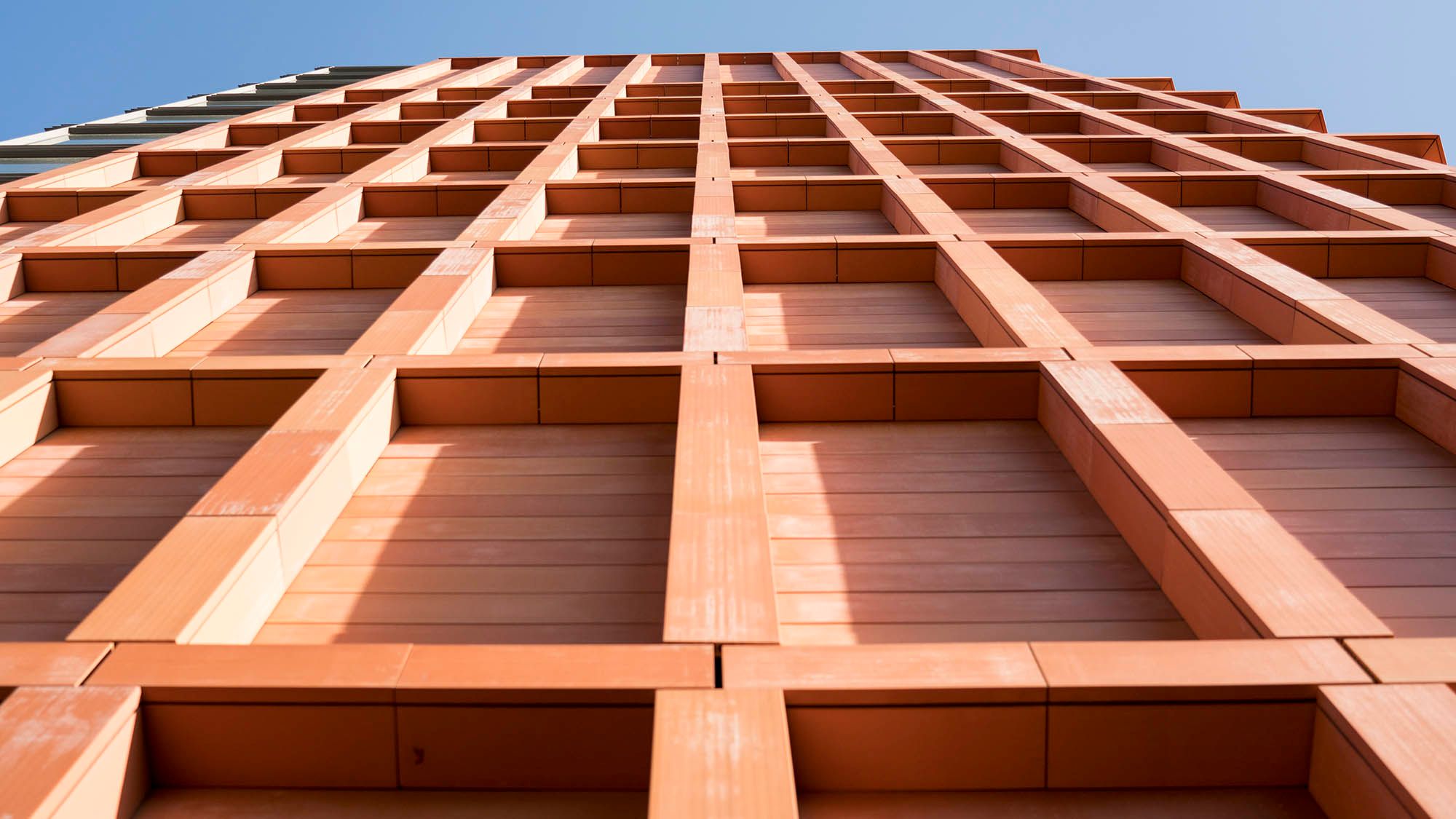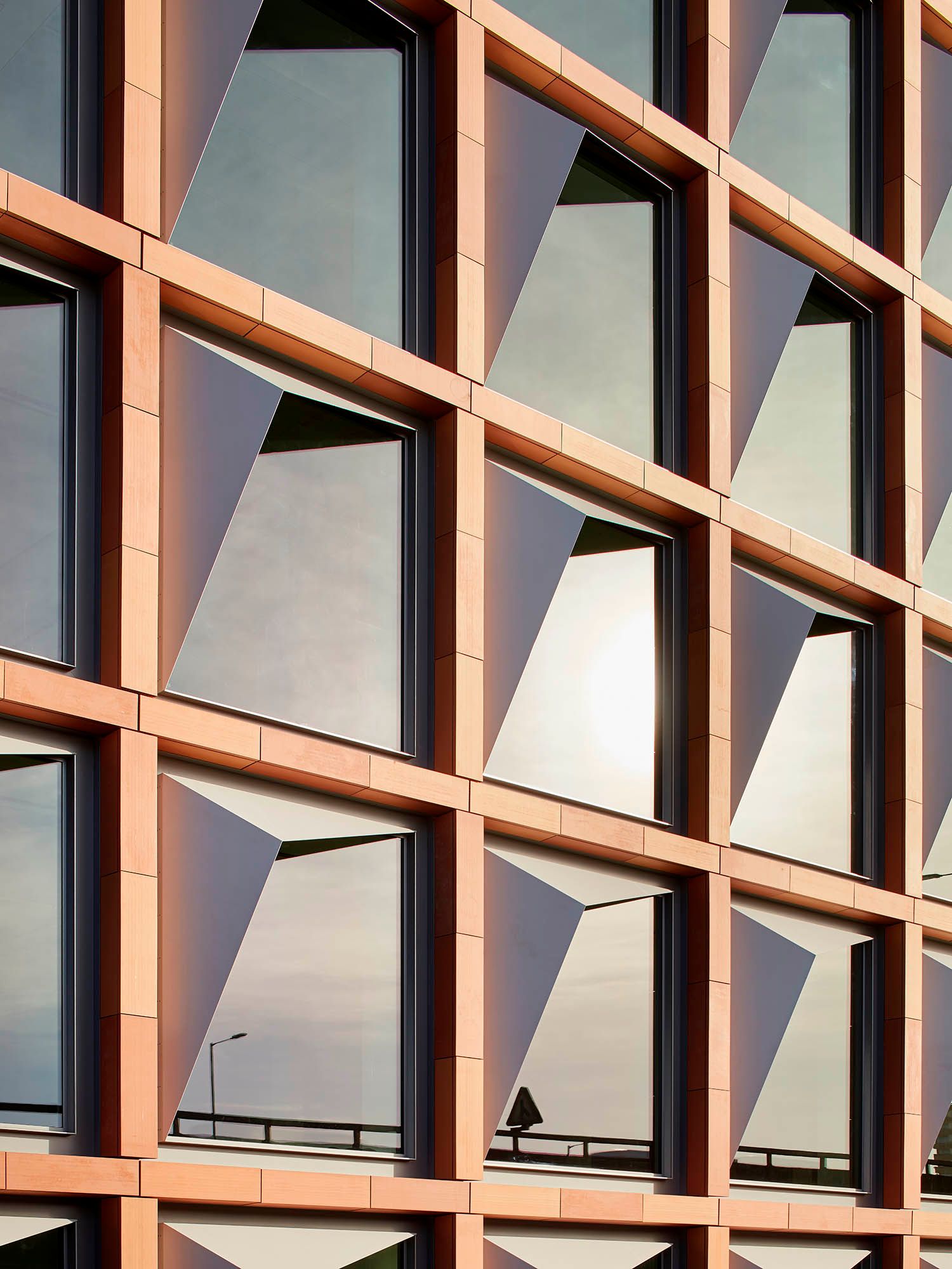 The façade combines glass, terracotta and folded metal panels to create a layered architectural expression with depth, rhythm and environmental performance. This gives the building a strong presence within White City while reinforcing its role as a visible part of London’s emerging innovation district.