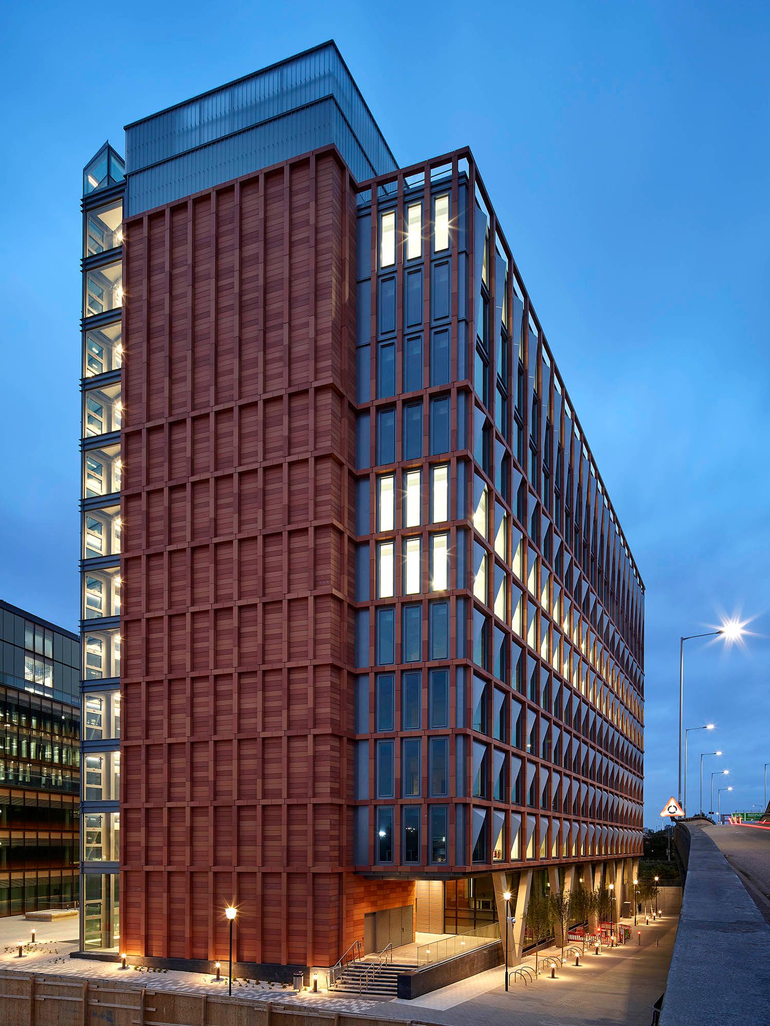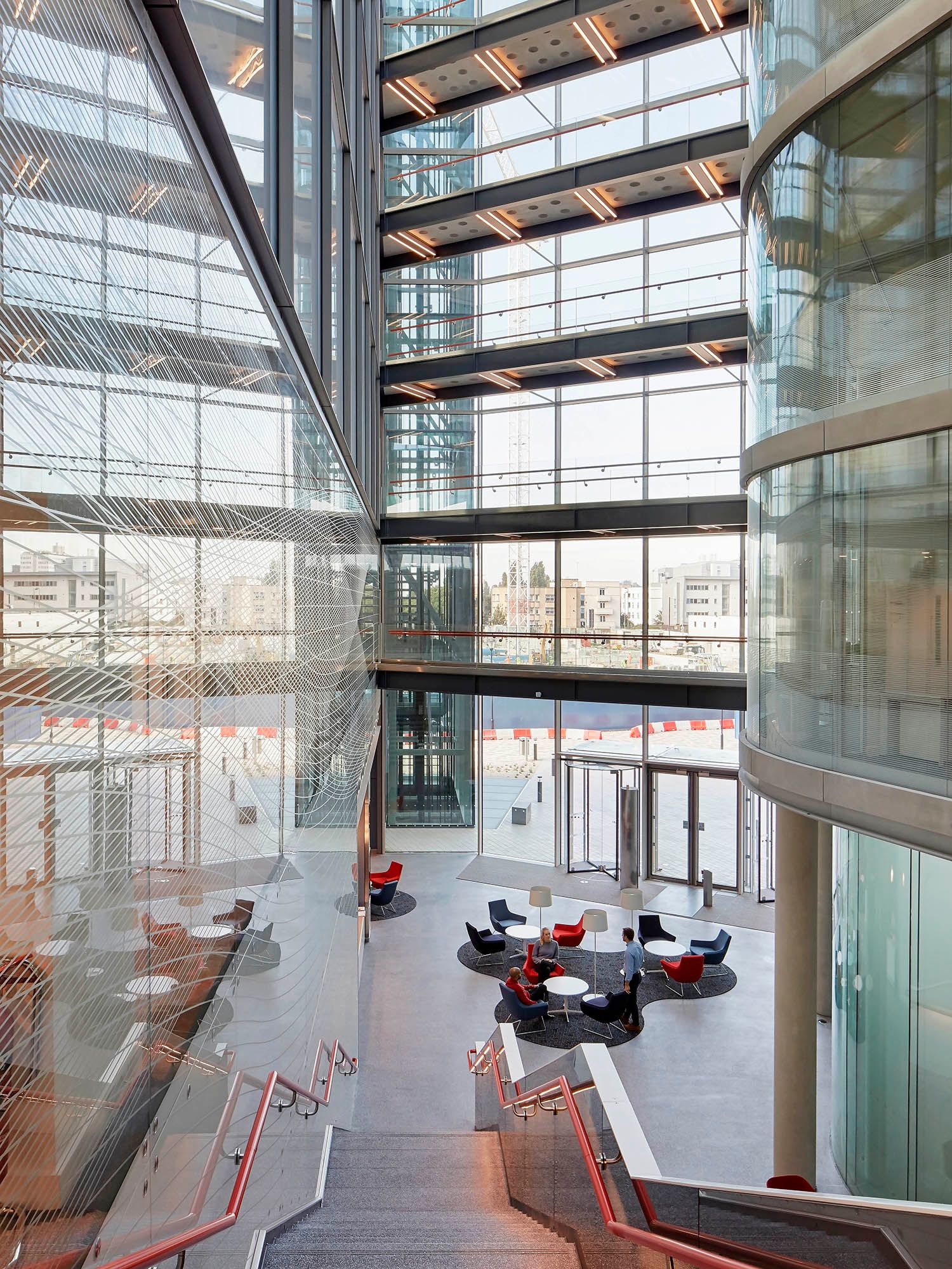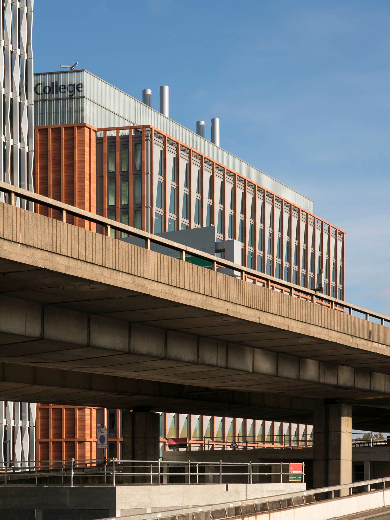 Organised into two wings of seven and twelve storeys, the building sits beside the Westway and acts as both a gateway and a buffer to the wider campus. A central atrium and open internal environments create visibility and connection across the building, while its position within White City helps strengthen links between academic research, business and the surrounding city.