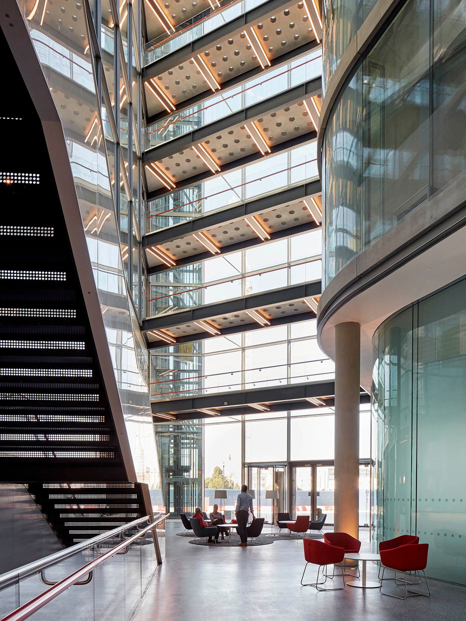 The atrium creates a shared internal environment that encourages visibility, movement and everyday exchange between different users of the building. By connecting research, enterprise and communal space, it helps support a more collaborative culture.
