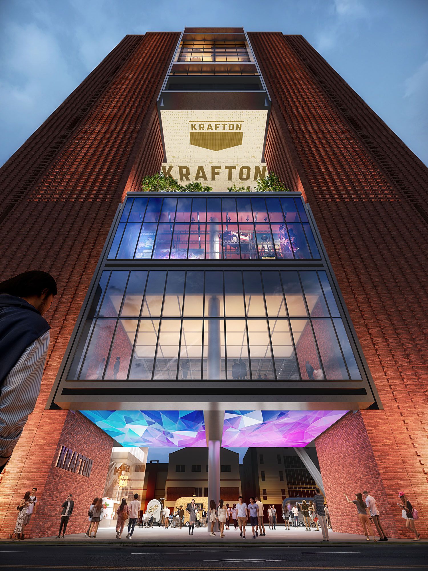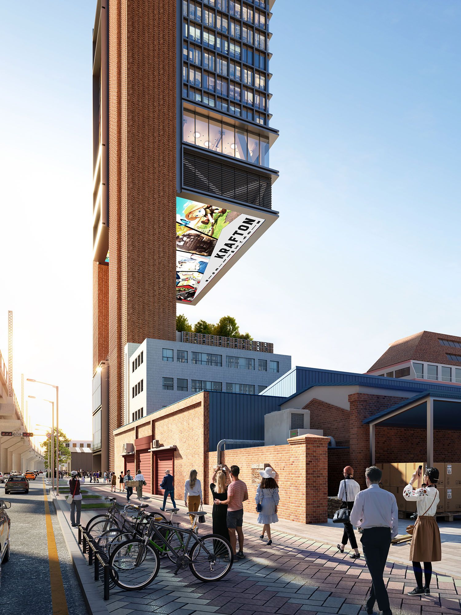 Materially, the building responds to Seongsu’s craft-based heritage through the use of brick screens and exposed steel structure, while digital media surfaces express Krafton’s contemporary identity and future-facing ambition. An off-centre core and expressive truss system allow for large, column-free studio floors and contribute to the tower’s distinctive external form.