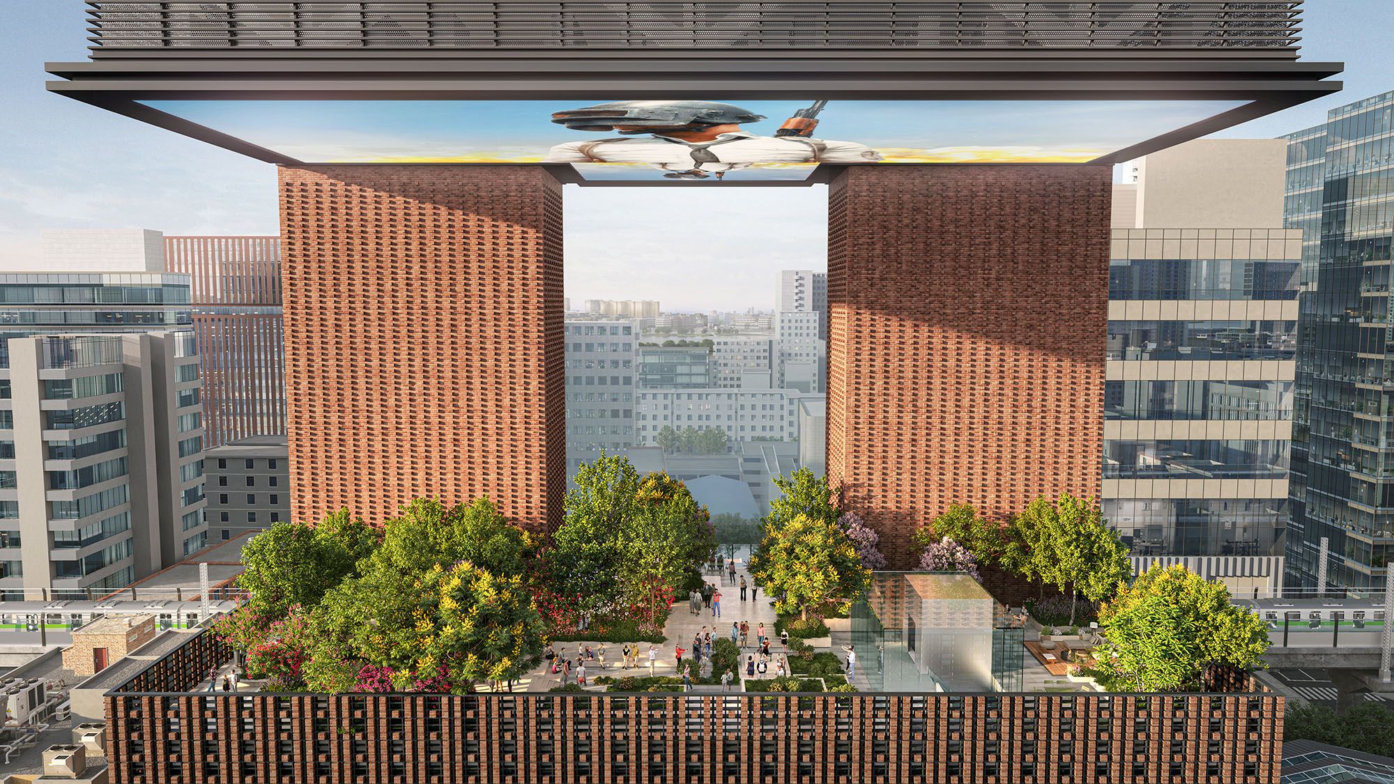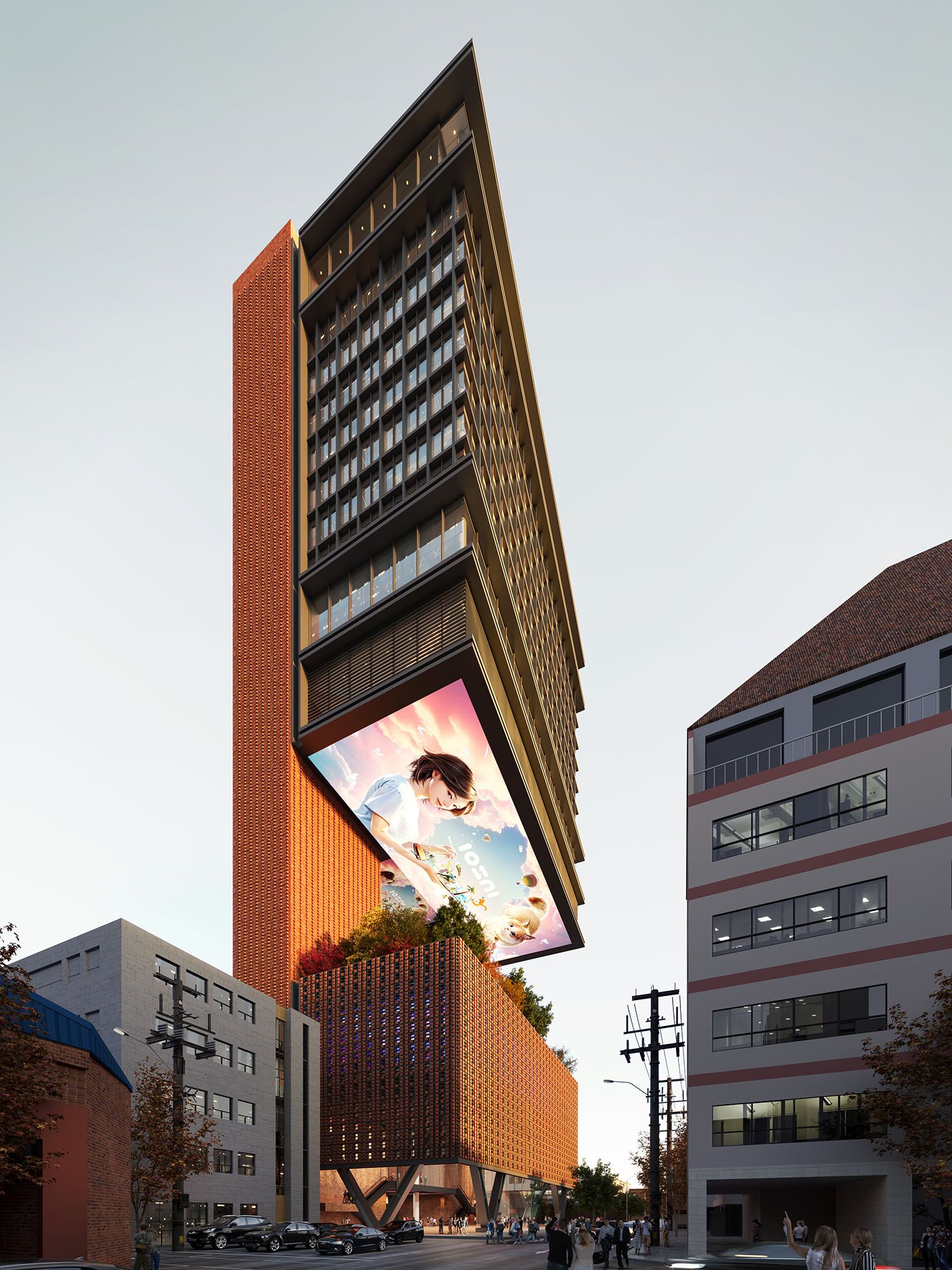 The architecture is organised into three distinct worlds. At ground level, the Ground World opens the building to the city through a porous public realm of cultural, social and shared spaces. Above, the K-Forest forms a suspended green platform for informal gathering and public events, creating a social heart within the tower beneath an interactive media soffit. Higher up, the Upper World accommodates modular, light-filled studio spaces designed for teams of 150 to 300 people, supporting flexibility, collaboration and a range of creative working styles.