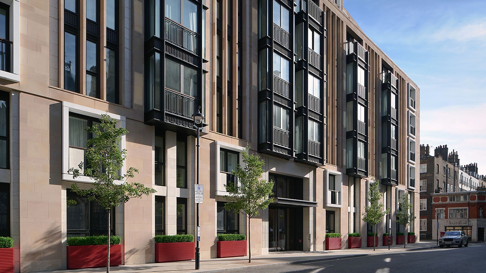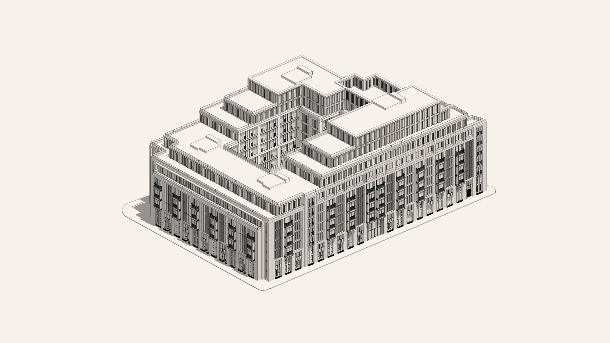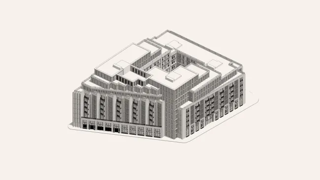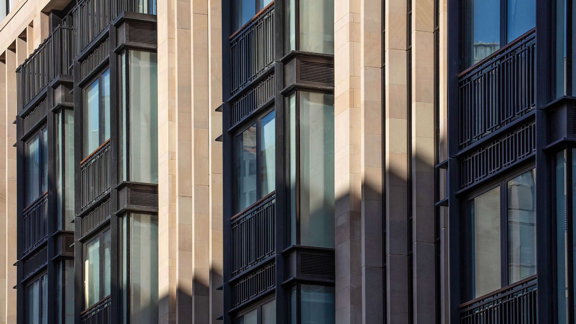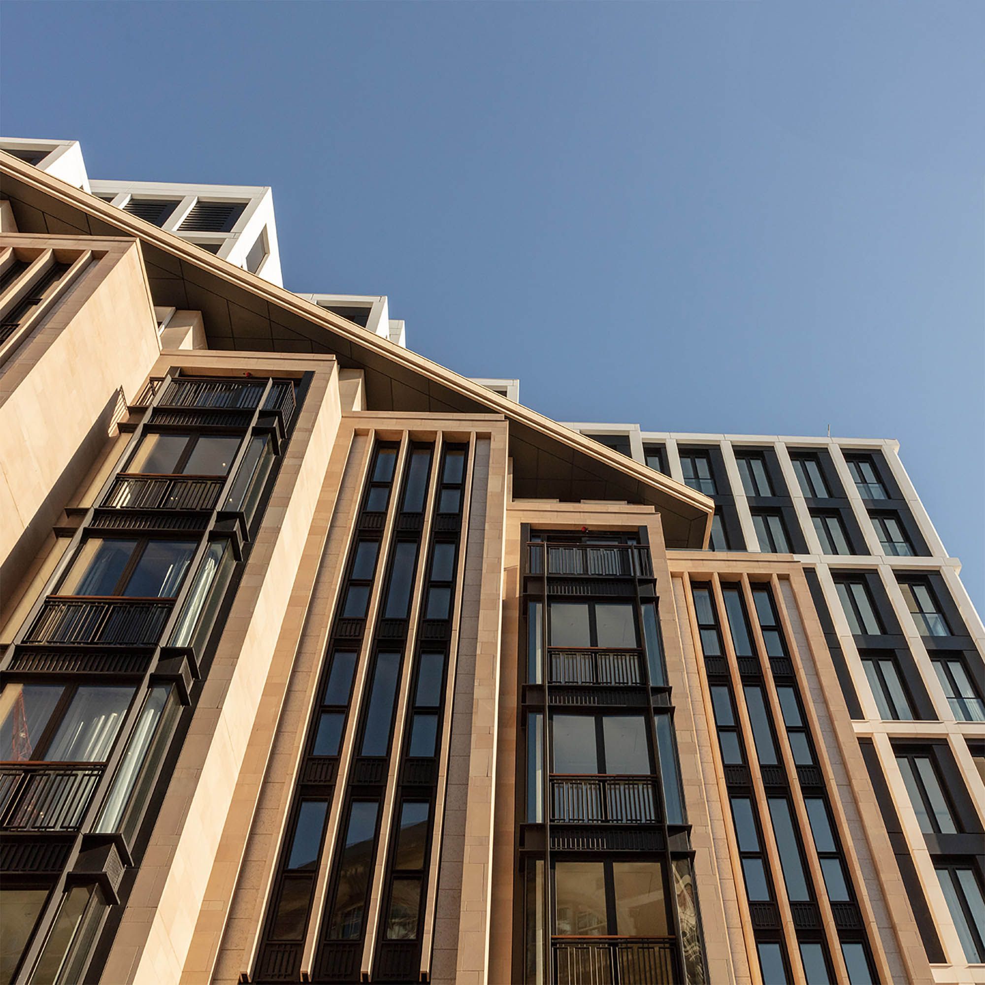 The stone façade is articulated through window bays, punched openings and vertical fins, with metal spandrel panels introducing a subtle horizontal rhythm across the elevations. Recessed landscaped terraces and upper-level pavilions reduce the building’s perceived scale, helping it sit more comfortably within both street-level and longer views across the surrounding neighbourhood.
