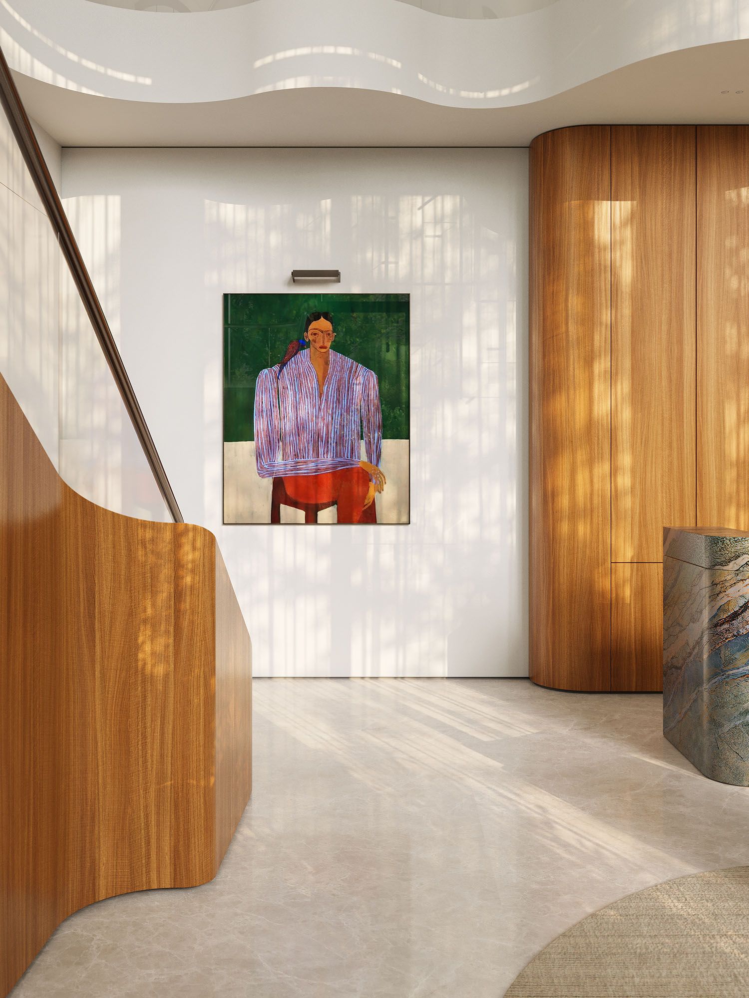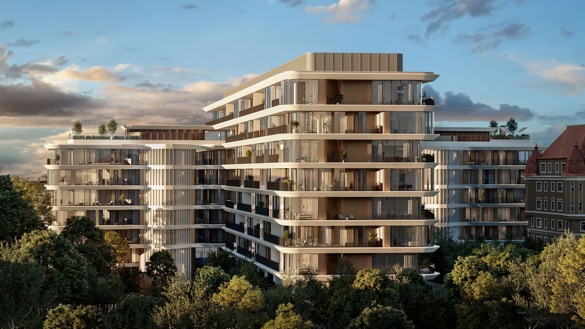 Defined by two overlapping volumes, the building creates a bold and elegant silhouette within Moscow’s historic Garden Ring. Softened edges, white balconies and bronze detailing give the façade a sense of rhythm, depth and fluidity.