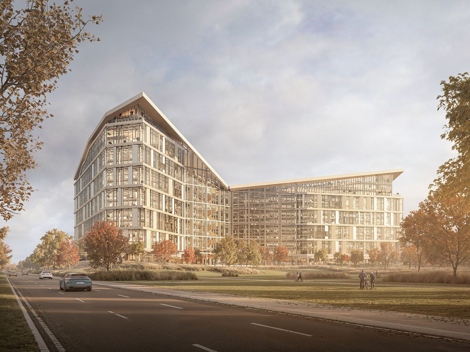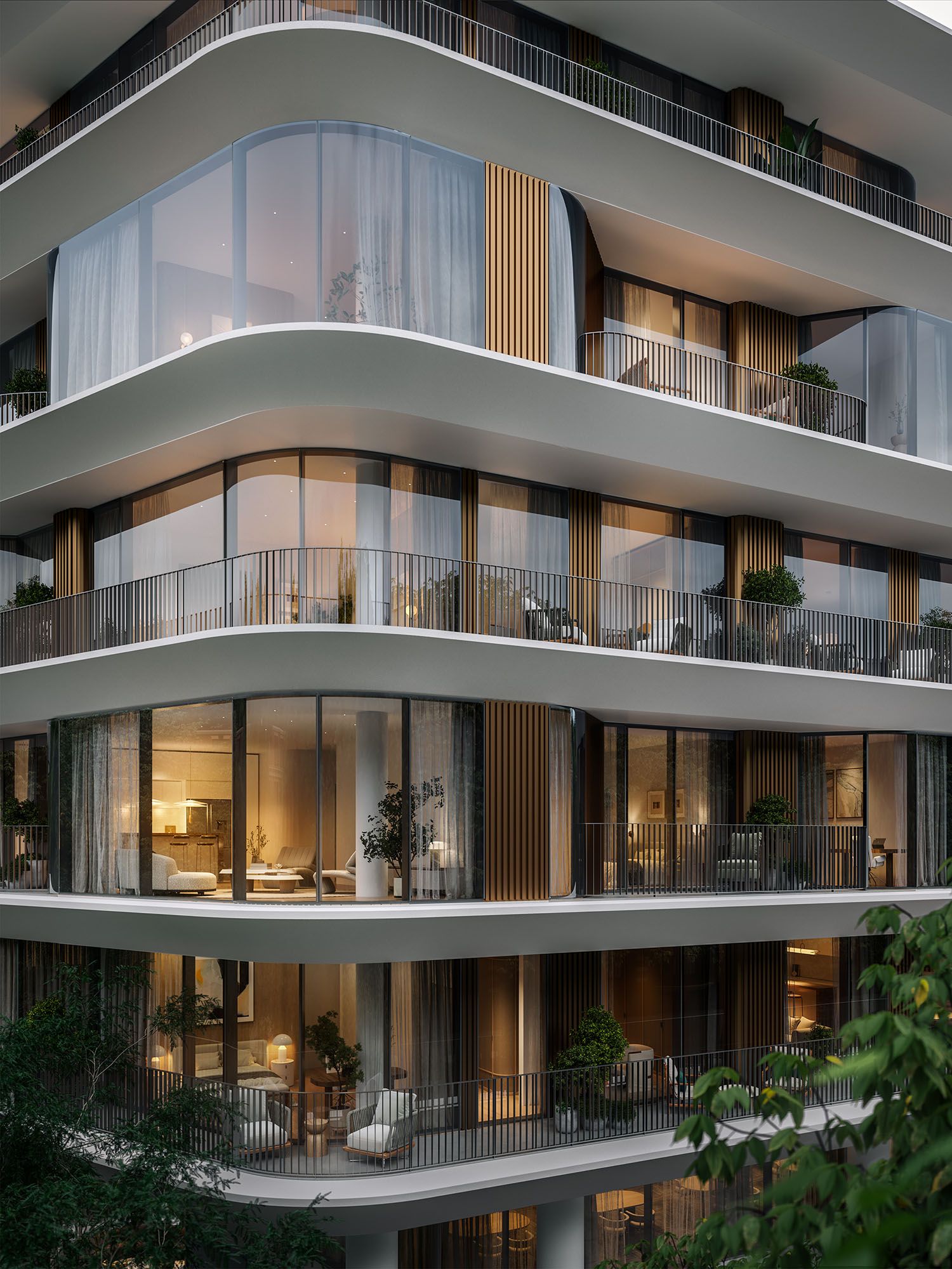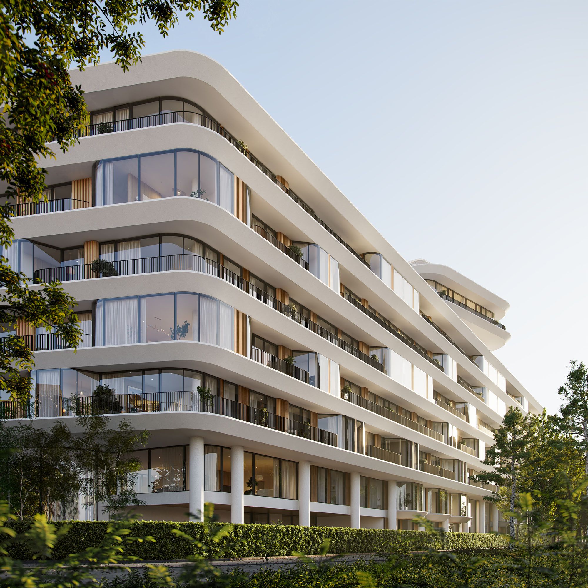 The building’s sculptural form is defined by two overlapping volumes, with the upper structure cantilevering dramatically over the lower to create a bold and recognisable silhouette. Softened edges, crisp white balconies and full-height glazing give the architecture a sense of lightness and fluidity, while vertical bronze elements add rhythm, depth and privacy across the façade. Together, these elements create a strong visual identity that is both elegant and highly distinctive within the surrounding urban fabric.