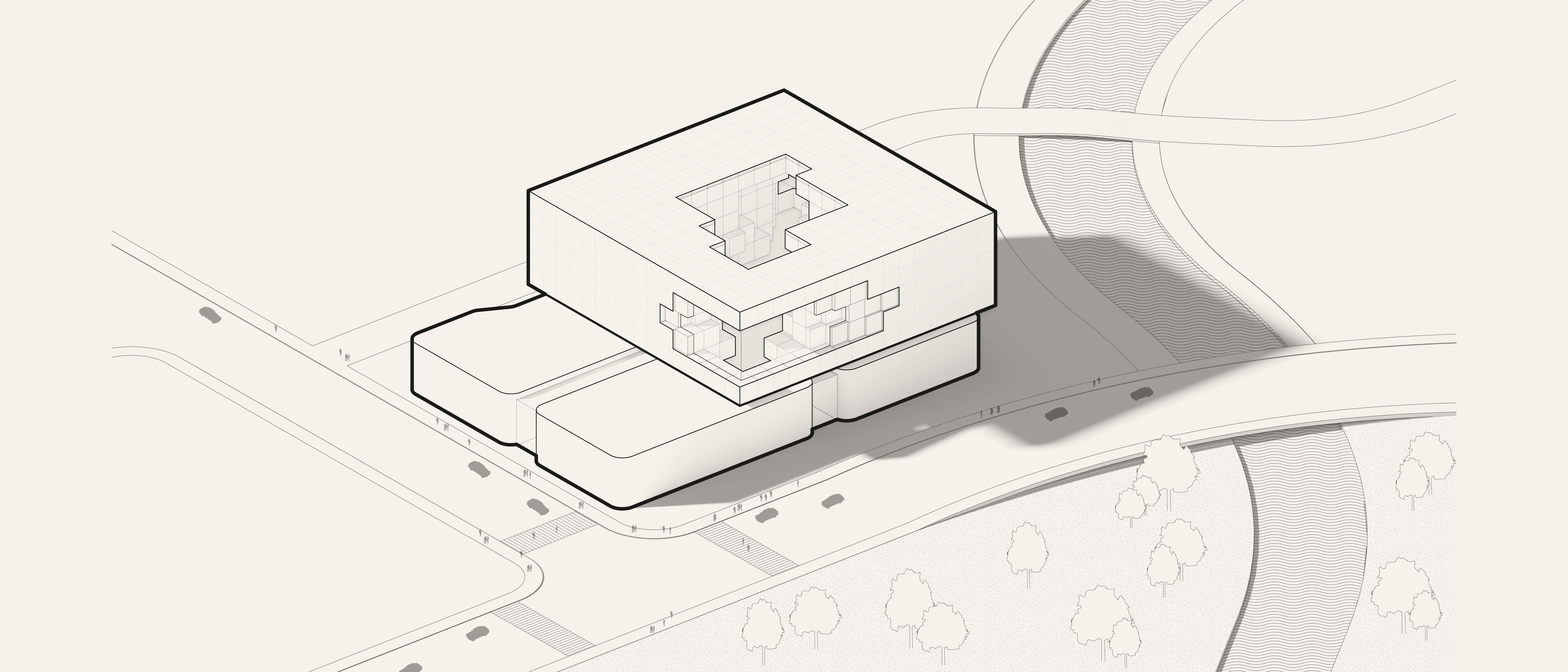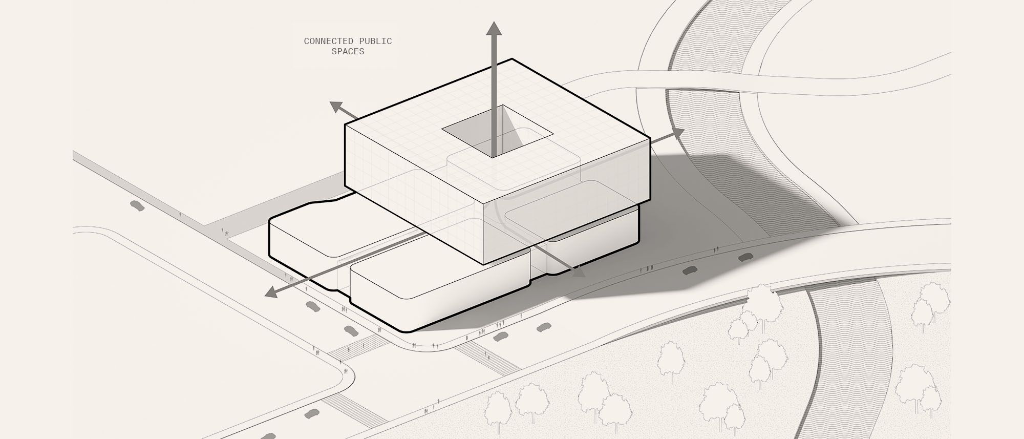 The podium is divided into four distinct volumes to improve permeability, introduce daylight and create clearer movement routes across the site. This fragmentation also helps reduce the scale of the mass while establishing a more open and connected ground condition.