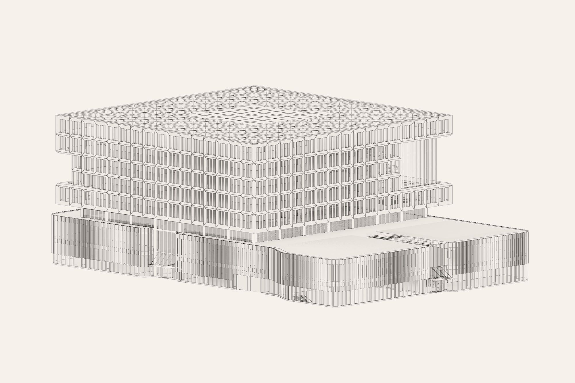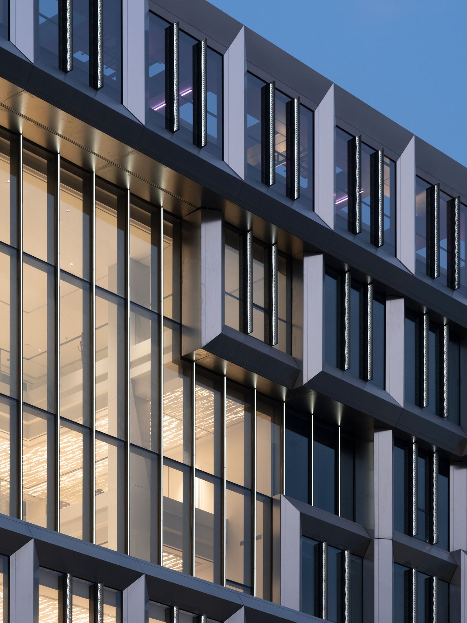 The scheme begins with a podium that defines the site footprint and anchors the building within its wider context. This lower volume accommodates the specialist labs and podium functions, creating a robust base for the programme above.