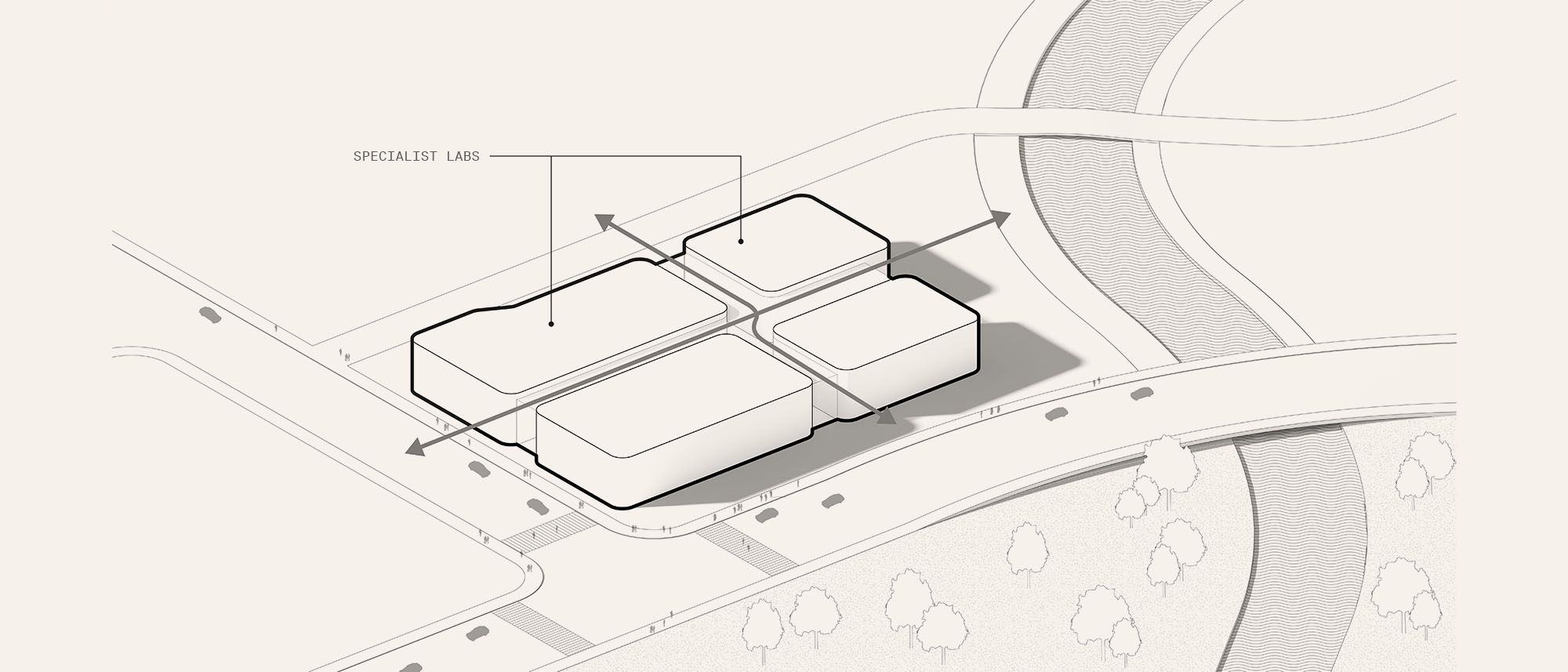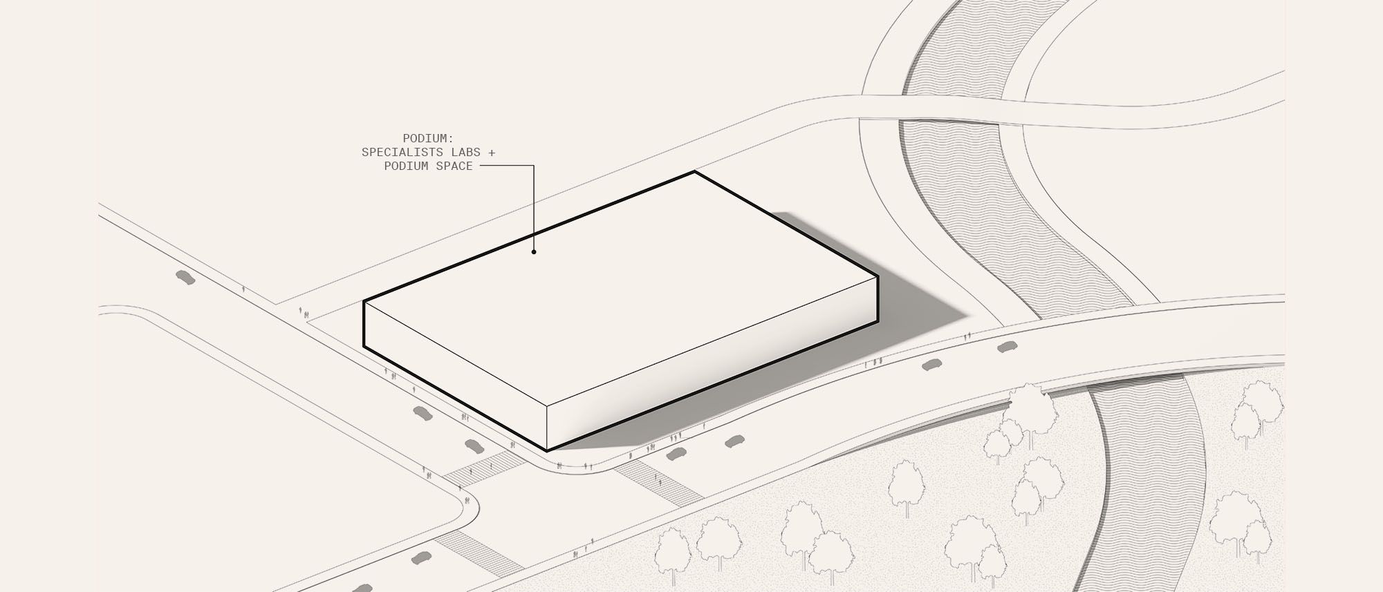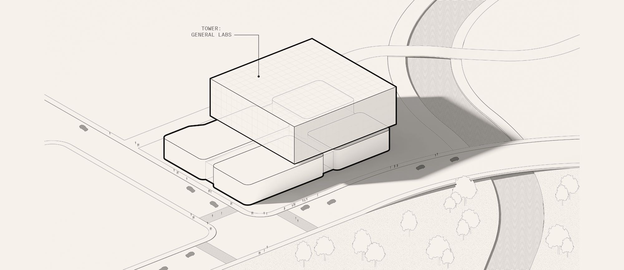 A larger upper volume is placed above the podium to accommodate the general lab spaces, separating them from the more specialised functions below. This stacked arrangement creates a clear organisational logic between the podium and tower programmes.