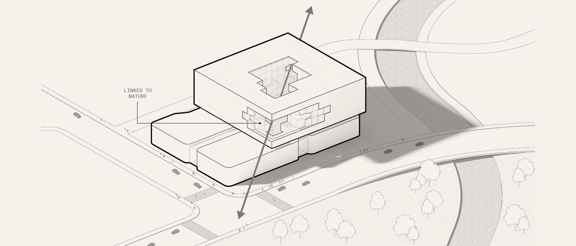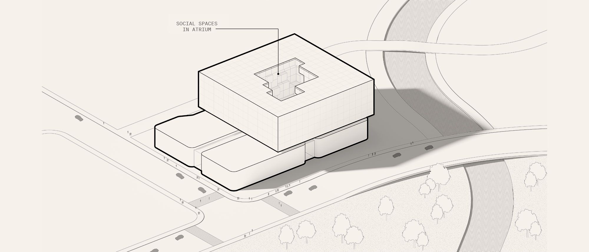 A central void is carved from the tower volume to create a vertical atrium that brings light, openness and orientation into the heart of the building. This move also establishes stronger visual and spatial connections between the different programme layers.