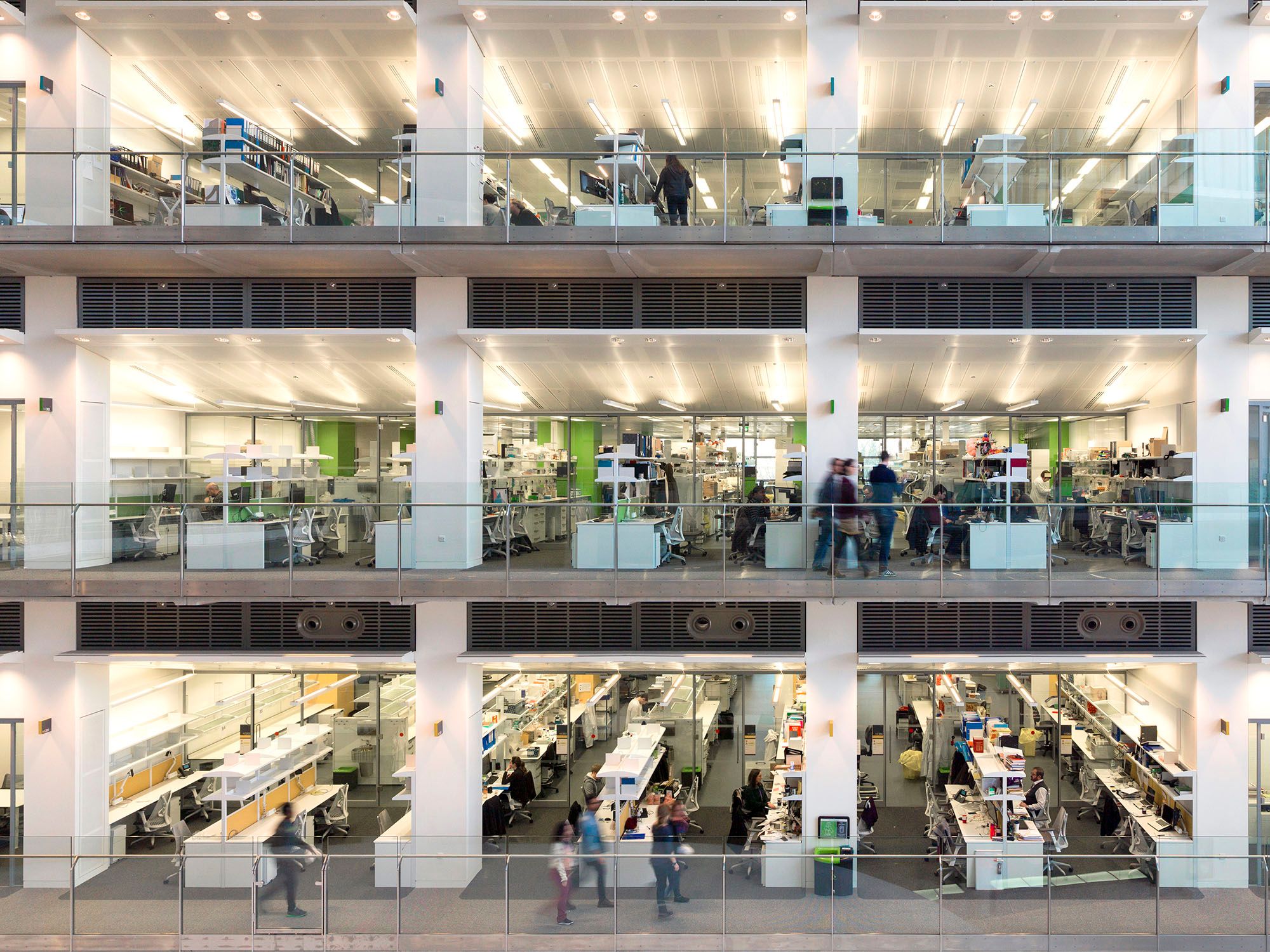 The building combines Super Labs, Specialist Labs, General Labs and Data Centres with communal workspaces, breakout zones and planted roof terraces, all connected by a central atrium that encourages informal exchange. This varied mix of spaces supports experimentation, focus and collaboration at every level, from deep technical research to interdisciplinary discussion.