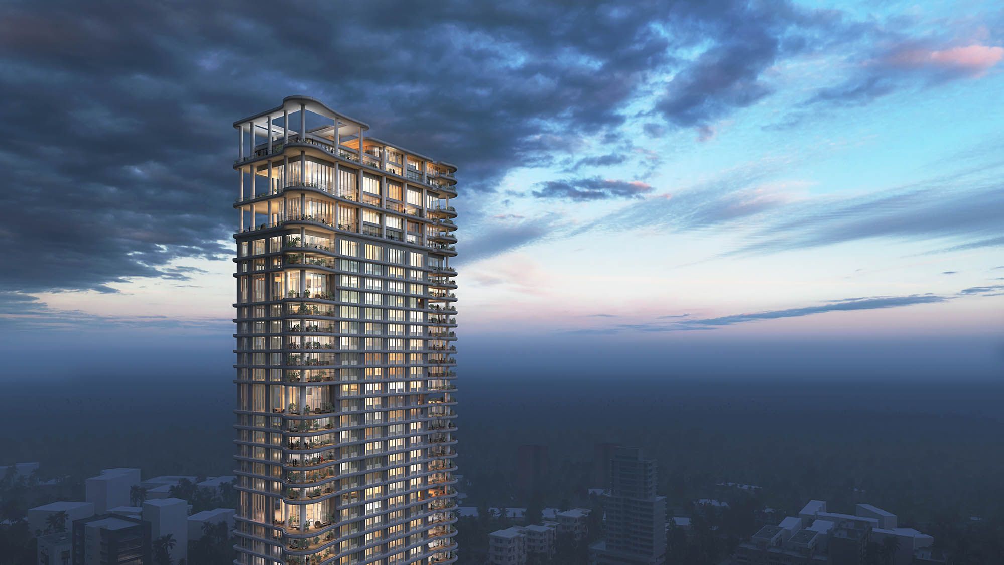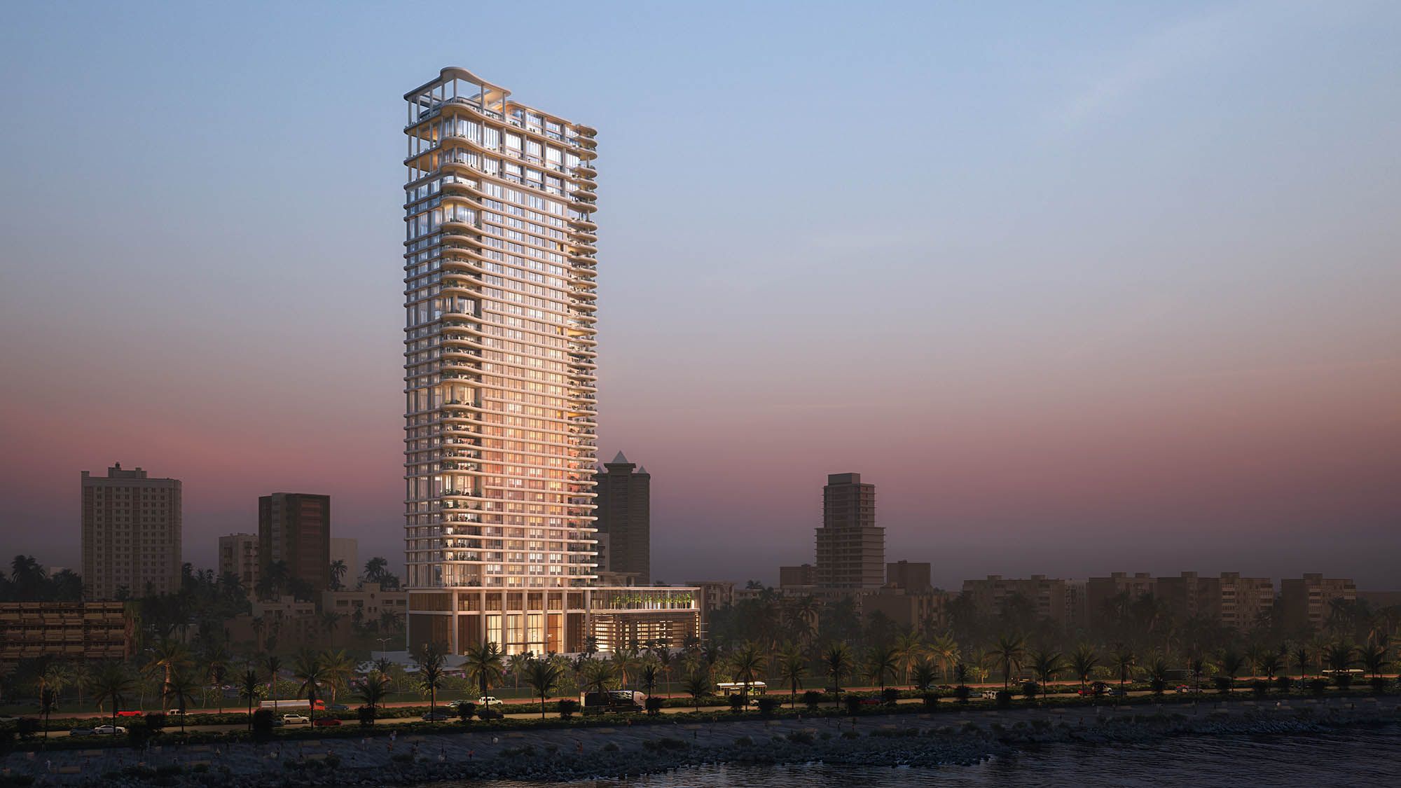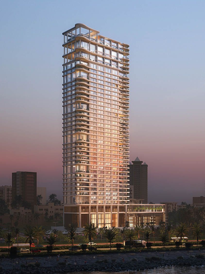 Positioned along Mumbai’s iconic seafront, the building responds to the energy of the promenade while presenting a refined and elegant presence to the city. Carefully articulated frontage and materiality give the tower a strong civic presence while reinforcing its sense of exclusivity and address.