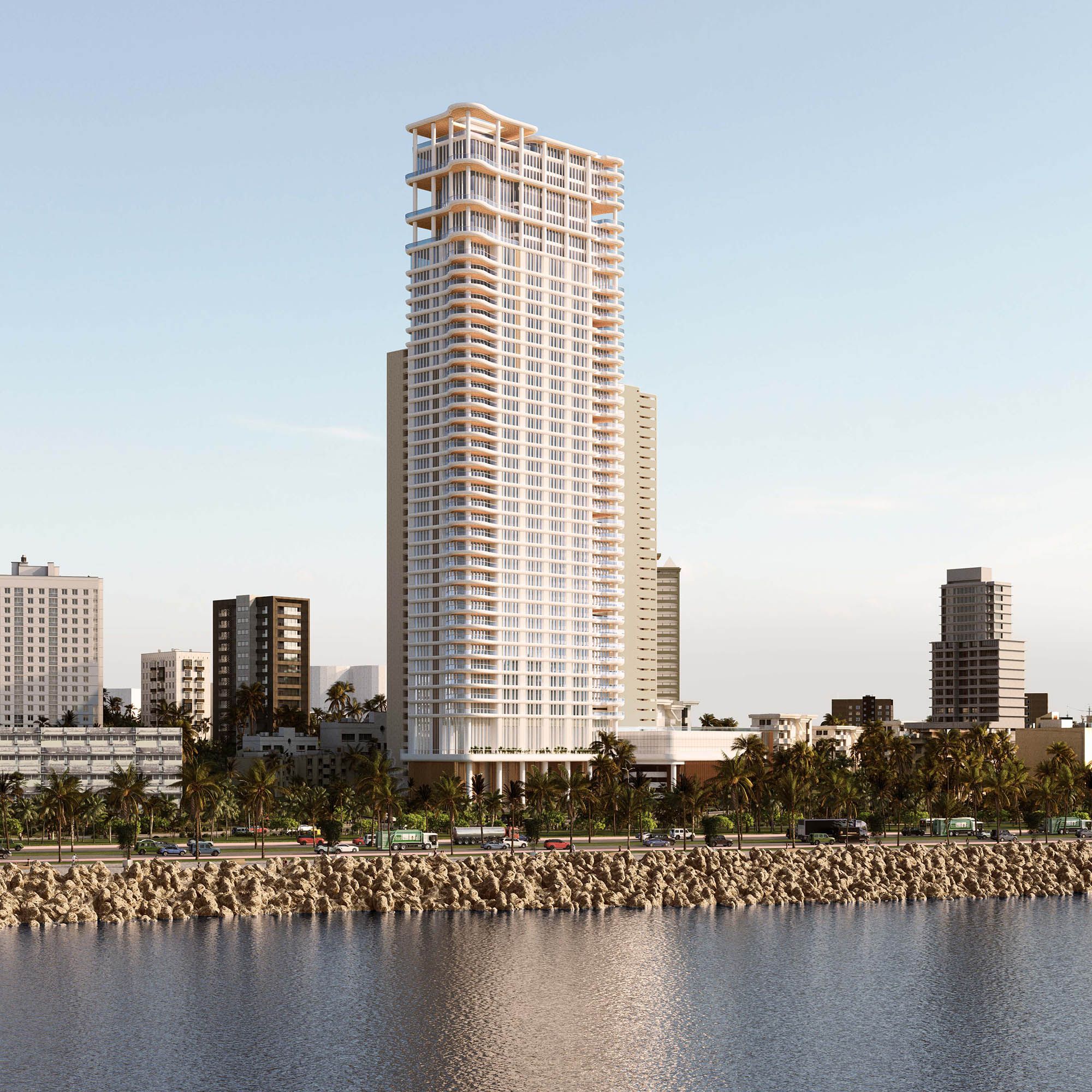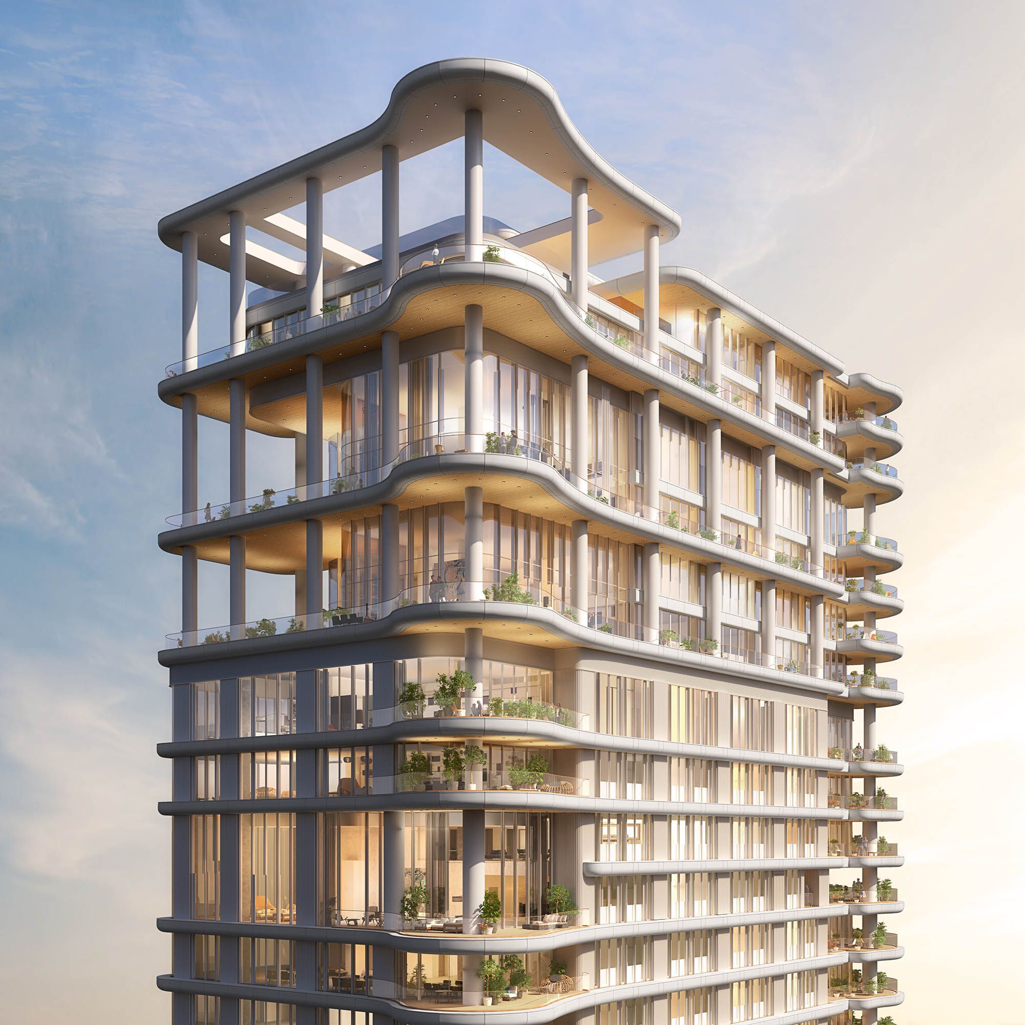 The façade draws from the fluid qualities of the coastline, using soft curves and a light material expression to respond to shifting light and atmosphere throughout the day. This gives the building a sense of movement and softness, while maintaining the clarity and discipline of a highly resolved residential form.